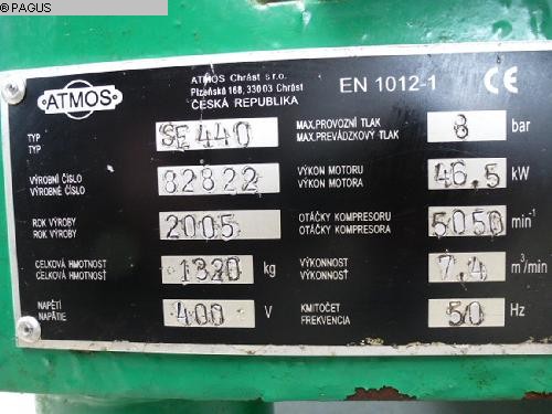 feed pressure:8 bar :Verd. 5050 min /1 voltage:400 V rated current:90 A total power requirement:46,5 kW weight of the machine ca.:1320 t dimensions of the machine ca.:1800 x 1600 x 2300 mm frequency:50 Hz Effizienz::7,4 m3/min IP::54 / 20