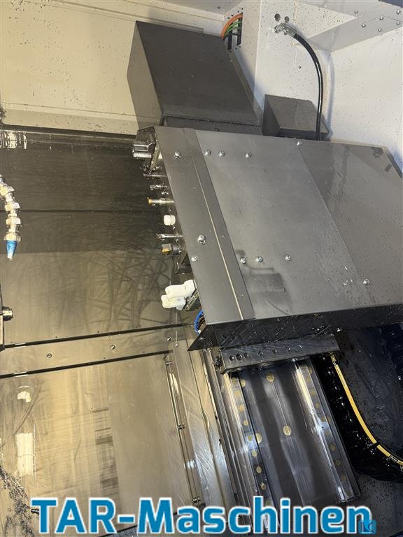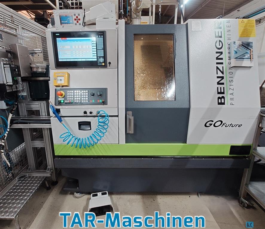 turning diameter:26 mm Article: High-precision CNC lathe with linear cross slide Manufacturer: Benzinger Type: GOFuture B1 Yob: 2015 Machine was only used for reworking, so only light machining work was carried out! Control: Siemens Sinumerik 840Dsl Main spindle: maintenance-free motor spindle Bar capacity: D26mm Chip processing container with coolant pump: 30l/min at 5bar Loading and unloading device type IB Additional gripper system for placing the workpieces in the correct position on the unloading conveyor Coaxial valve for coolant to the linear tools (3 pieces) Internal clamping device C-axis main spindle for digital control incl. Transmit function Adjusting microscope 16x magnification Coolant supply through the clamping cylinder of the spindle, sealing air, Speed increase of the motor spindle to 8,0000 rpm Nordmann tool monitoring Profibus master interface Hinged belt conveyor Kno ...