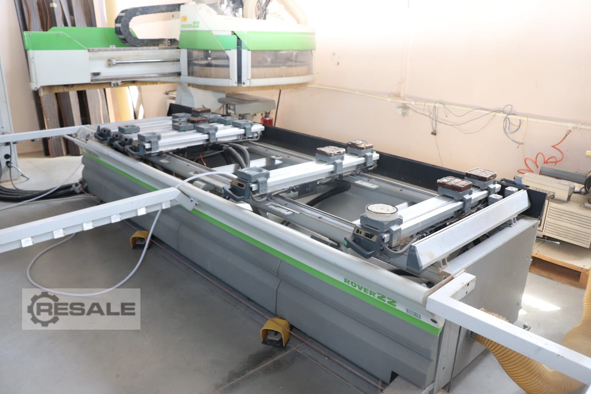 Biesse Italy, Rover 22 CNC Machining Center Built in 2001 SN 07498 Workspace 4 axes X-axis 3060 mm Y-axis 1080 mm Z-axis 155 mm 6 consoles with 18 vaccum suction holder 4 pneumatic bakelite rods for lifting the plate Vertical electric spindle 7.5 kW with automatic tool change, ISO 30 cone Automatic tool change 7 positions on the working head Drill head with 20 spindles arranged as follows: 7 vertical in X-axis 7 permeable to Y-axis 4 horizontal in X-axis 2 horizontal in Y-axis Groove saw 120mm Safety tread mats 110 m3 / h vacuum pump CE marked Weight 3500 Kg Technical information subject to reservation