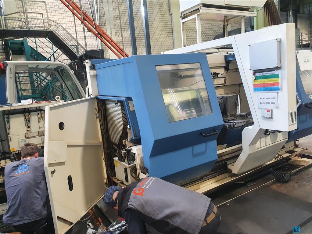 Diámetro de giro sobre la bancada/corredera transversal: 570 mm/365 mm, altura central: 280 mm, longitud de giro: 1000 mm, diámetro del husillo: 62 mm, velocidad: 2500 rpm, velocidad de avance X/Z: 5 m/10 m/min, diámetro de la caña: 80 mm, carrera de la caña: 190 mm. Dimensiones de la máquina X/Y/Z: aprox. 6000 mm/2500 mm/2000 mm, peso: aprox. 5600 kg, control: Siemens Sinumerik 805. Documentación disponible. Es posible realizar una inspección in situ.