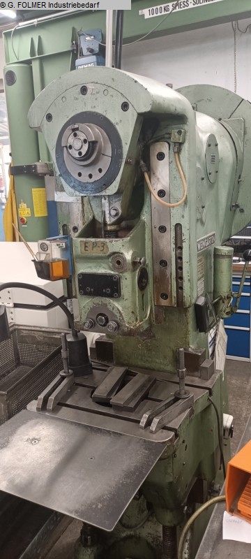 From the Gütersloh site, we offer a well-preserved eccentric press Pressure 100 t Projection 330 mm Stroke 10-130 mm Stroke rate 56 stroke/min Plunger adjustment 80 mm Table surface 830x600 mm Plunger area 250x130 mm Table height 870 mm Peg hole in plunger 50 mm Machine weight approx. 11 t Space requirement approx. WxDxH 2100x1900x3000 mm
