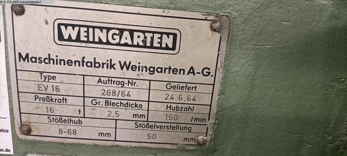 WEINGARTEN DE 200-20 press built in 1975 in Germany is used for precision workpiece machining. The rigid construction combined with a high press force of 200 tonnes make the machine the perfect solution for mass production of various types of parts. The process of precision sheet metal pressing can be fully automated when the WEINGARTEN press is retrofitted with a sheet metal feeder. Technical specifications of the WEINGARTEN DE200-20 200 t press - press force: 200 t - maximum slider stroke: 200 mm - minimum slider stroke: 15 mm - maximum number of slider strokes: 60/min - minimum number of slider strokes: 20/min - slider adjustment: 110 mm