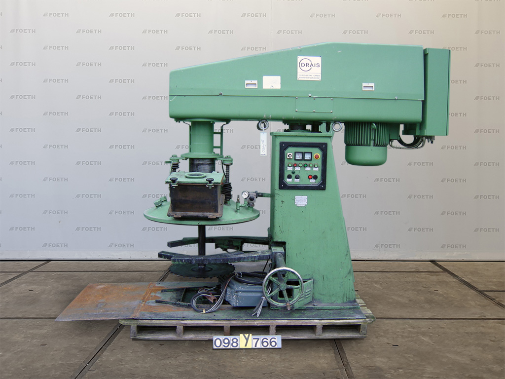 General SKU098Y766 MakeDrais TypeRN 2/30 VAC No.51789 Year of construction1984 LocationBarneveld Pressure Working pressure0 Bar Vacuum possiblecheck Main Features MaterialMild steel Motor30 KW Specified Features - Dissolver Dissolver(1x) Shaft length± 700mm Disc diameter600mm Between shaft and frame± 550mm With covercheck Motor30,0 kW (400 V, 1475 rpm) With variable speed drivecheck With hydraulic liftingcheck With vacuum pumpcheck Motor1,5 kW MaterialMild steel Information With switchgearcheck Floorspace2,8 x 2,2 m Total height2,4 m Weight2500 kgDissolversCatalysts & fillersSolventsDiscountDetergent & surf.Other pharmaceuticsLubricants & oleoOther feedDyes & pigmentsMinerals & inorganicOther chemicalFine chemicalsOintmentsPaints & coatingsOils & fatDraisMixers > DissolversIndustries > Chemical > Catalysts & fillersIndustries > Chemical > SolventsDiscountI ...