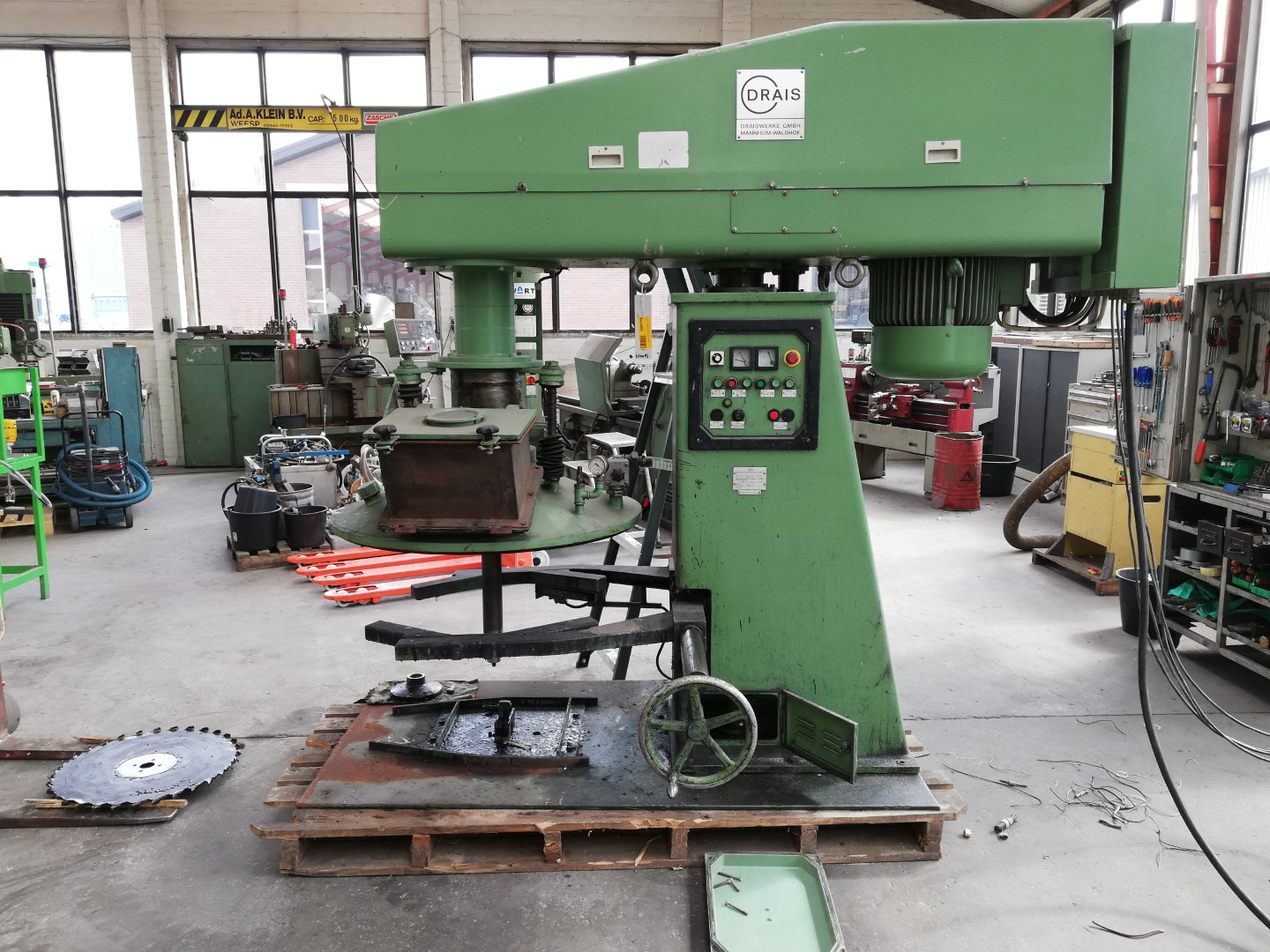 General SKU355W953 LocationBarneveld CEcheck MakeKurt Schneider TypeSHD 75 KW Main Features MaterialStainless steel Motor75 KW Specified Features - Dissolver Dissolvercheck Shaft length800 mm Disc diameter600 mm Between shaft and frame800 mm With covercheck Motor75 kW, 380-420 volt, 1478 rpm Speed mixing shaft141/1300 rpm With hydraulic liftingcheck Motor1,5kW, 400V, 1690 rpm MaterialHard chrome, stainless steel 1.4000 (aisi 429) Information No.00340 Year of construction1999 With switchgearcheck Floorspace2,70x1,90 m Total height2,50 m Weight2600 kgDissolversCatalysts & fillersSolventsDetergent & surf.Other pharmaceuticsLubricants & oleoOther feedDyes & pigmentsMinerals & inorganicOther chemicalFine chemicalsOintmentsPaints & coatingsOils & fatKurt Schneider SulzheimMixers > DissolversIndustries > Chemical > Catalysts & fillersIndustries > Chemical > SolventsIn ...