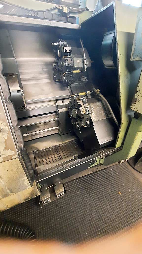 turning diameter: 340 mmturning length: 950 mmcontrol: OSP P300L turning diameter over bed: 580 mmturning dia. over face-slide: 470 mmWorkingspindle:: power capacity - main spindel: 22/15 kWturning speed range - main spindle: 45 - 5000 U/minspindle diameter: 120 mmspindle bore: 80 mmmax. bar capacity: 72 mmspindle head: JIS A2-6 spindle cone: 82 x 2° Torque: 350 Nmtravel -z axis: 1010 mmfeed per revolution: 0,001 - 1.000 mmrapid traverse: 30 m/minx - axis: travel -x axis: 260 mmfeed per revolution: 0,001 - 1.000 mmrapid traverse: 25 m/minC-Axis: 0,001 °Rapids C - Axes: 200 min -1rapid traverse: 12 m/miny-axis: 120 mmtotal power requirement: 31,7 kVAweight of the machine ca.: 4,6 tdimensions of the machine ca.: 2,2 x 1,8 x 1,8 mâ½ing and milling centreequipped with:- CNC control OSP P300L- NC tailstock- 12-position turret with driven tool station (BMT 60) 6000 rpm- C, Y-axis- Chip ...