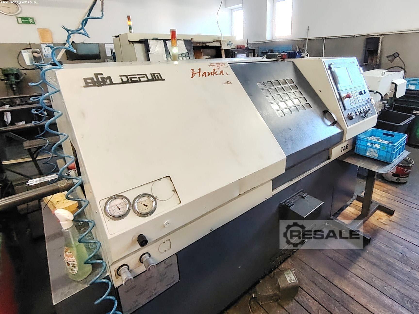 The AFM DEFUM TAE 35N CNC lathe is offered with equipment consisting of, among others, an advanced SIEMENS CNC controller with ShopTurn overlay and a chip conveyor. The total weight of the machine is approximately 3500 kg.