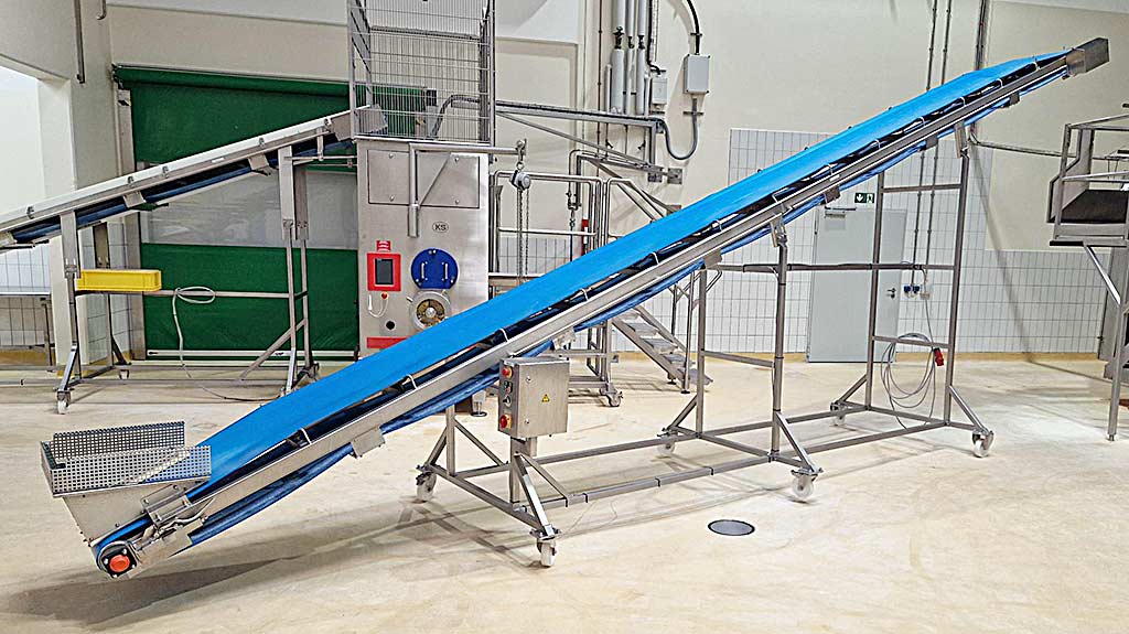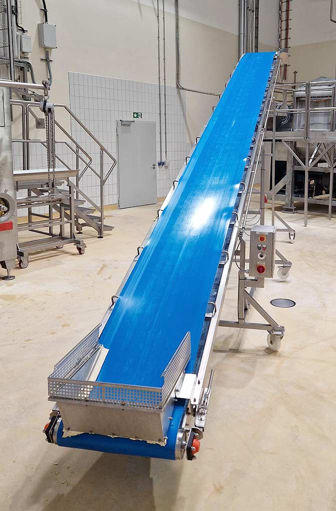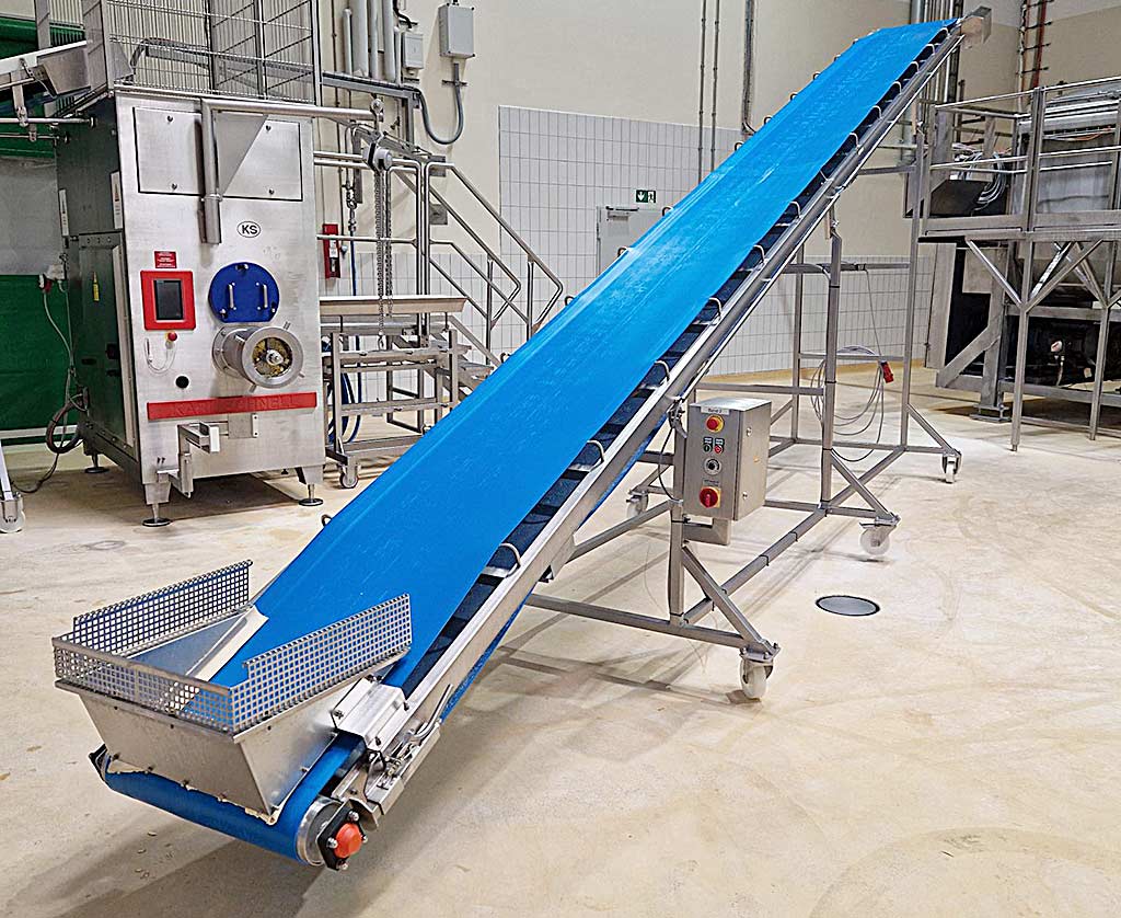 Existe una cinta transportadora de alimentos Kittner. Ancho: 600 mm, longitud total: 8300 mm, potencia del motor: 370 W, velocidad de la cinta: 6,6 m/min, ángulo: 31,5, altura de transporte: 3300 mm. Documentación disponible. Es posible realizar una inspección in situ.