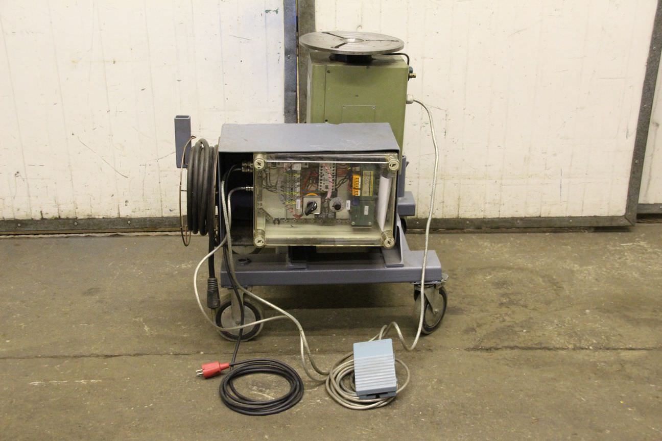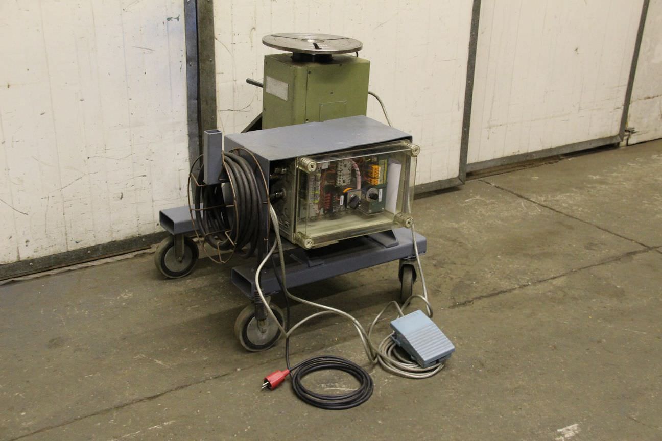 Container rotating device, welding rotating device, welding rotating device, welding device, welding rotary table, welding rotary and tilting table, welding rotating device -Table: is tiltable -Maximum load: 75 kg -Clamping diameter: 300 mm -Hollow shaft: Ø 42.5 mm -Drive: 0.1 kW -Speed: RPM -Quantity: 1x welding rotator available -Price: per piece -Dimensions: 830/450/H920 mm -Weight: 174 kg