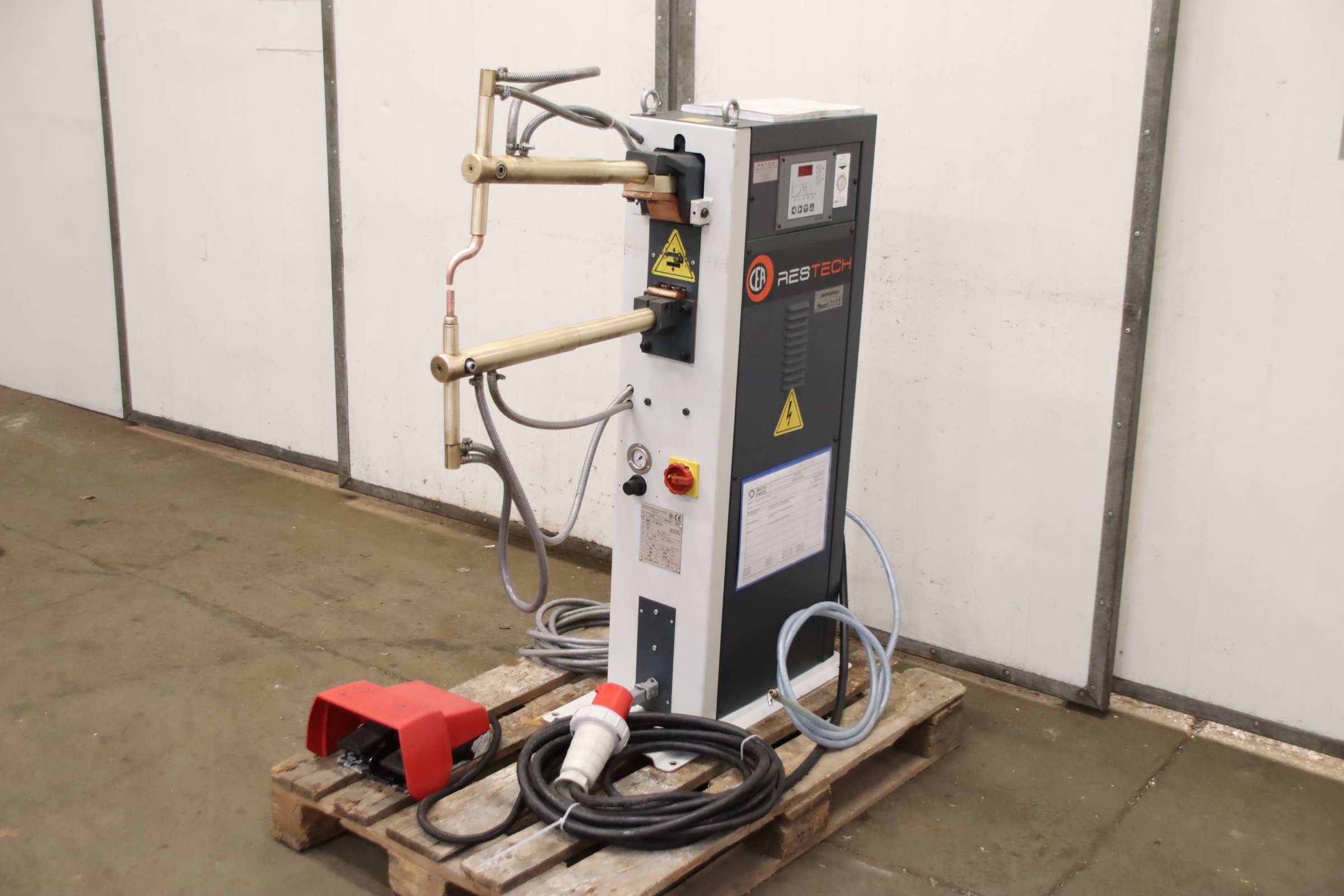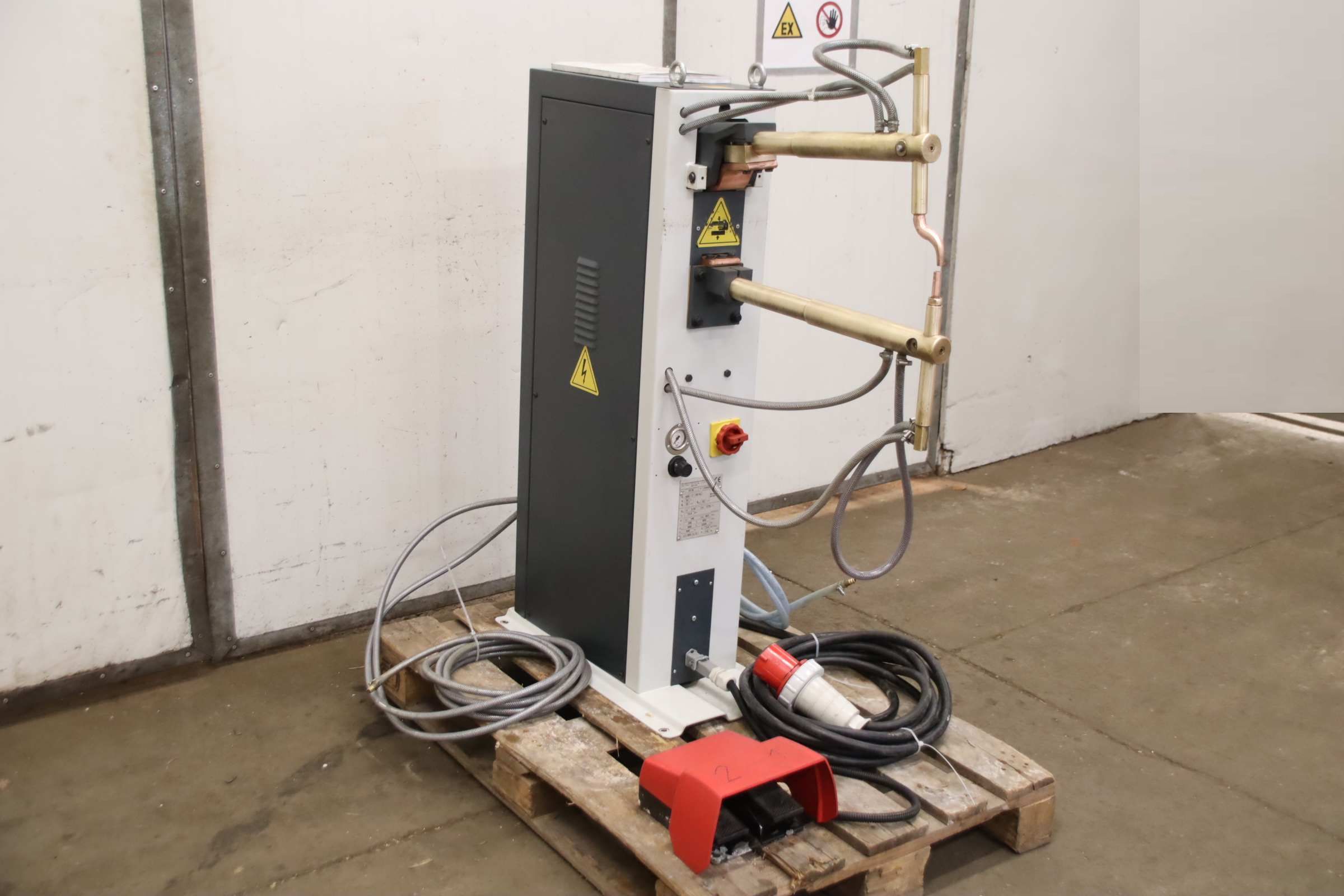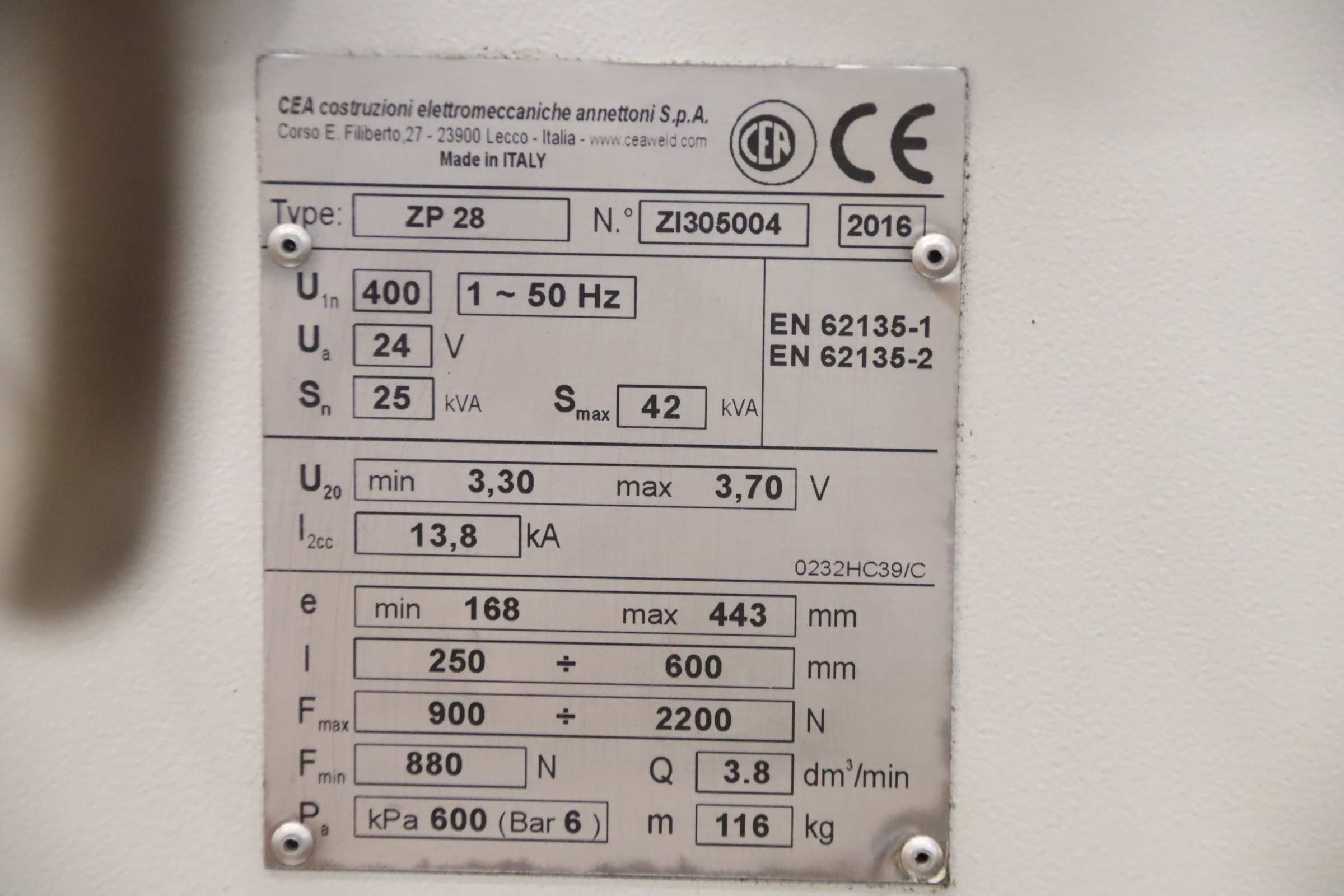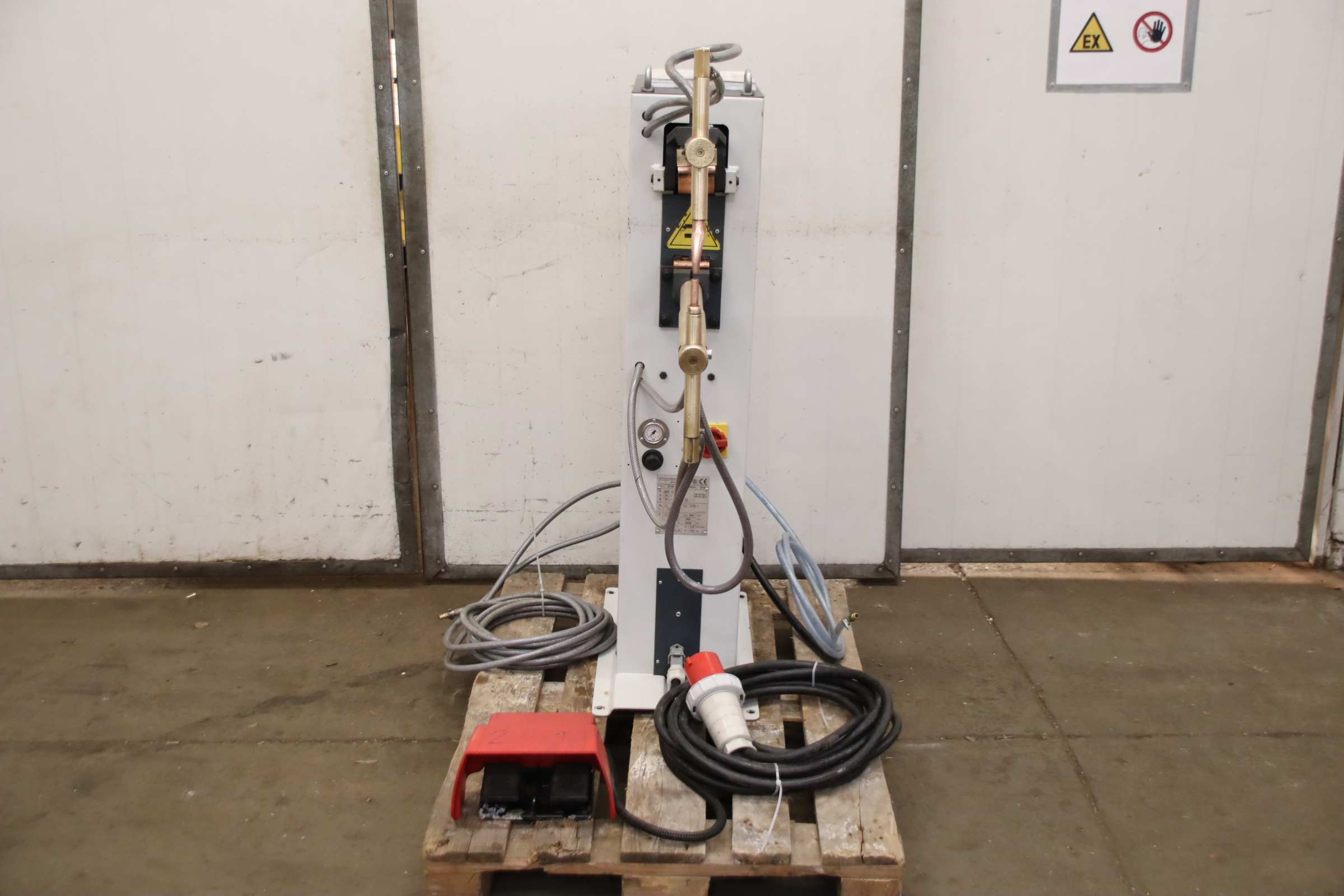 Spot welding machine, spot welding system, spot welding gun, resistance spot welding machine, lever-action spot welding machine -Manufacturer: CEA, rocker arm spot welding machine type ZP 28 -Rated power: 25 kVA -Arm length: 550 mm, adjustable length -Operation: via foot pedal -Dimensions: 1050/330/H1270 mm -Weight: 152 kg