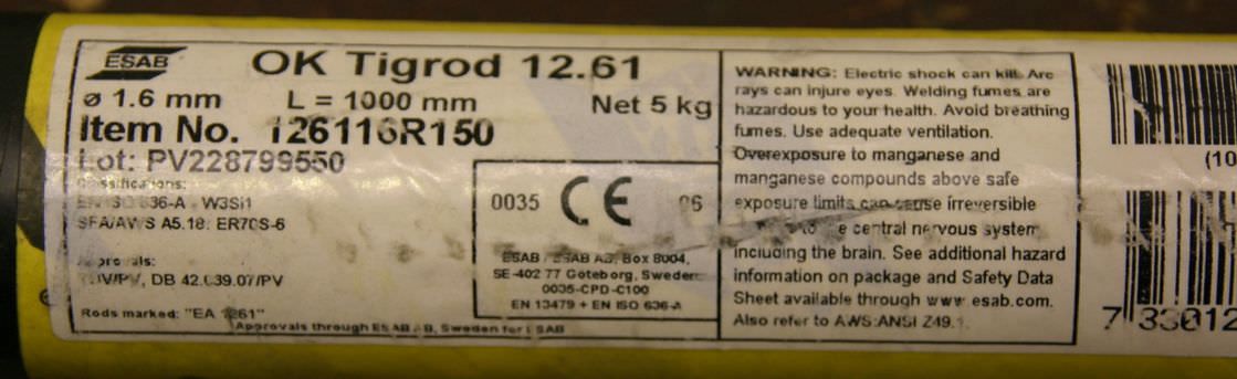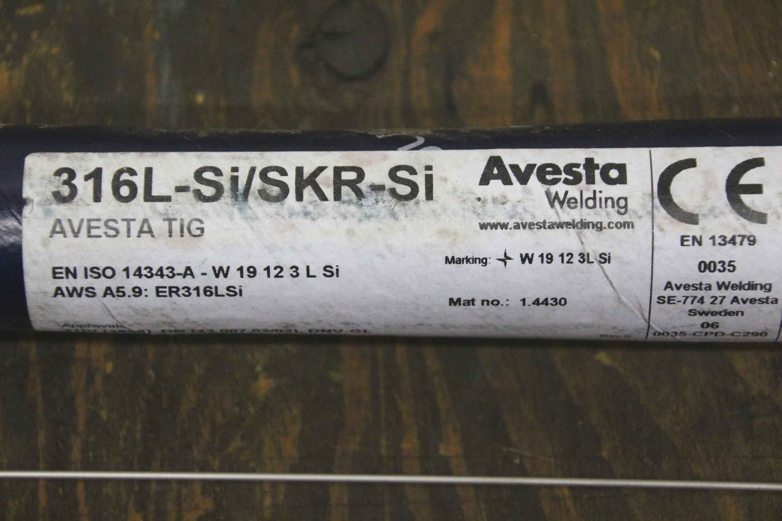 TIG welding rod, welding wire-Manufacturer: Avesta -Type: 316L-Si/SKR-Si Ø 1.6 x 1000 mm -Mat.no.: 1.4430 W 19 12 3L Si -Dimension package: Ø 42 x 1010 mm -Weight: 5.1 kg