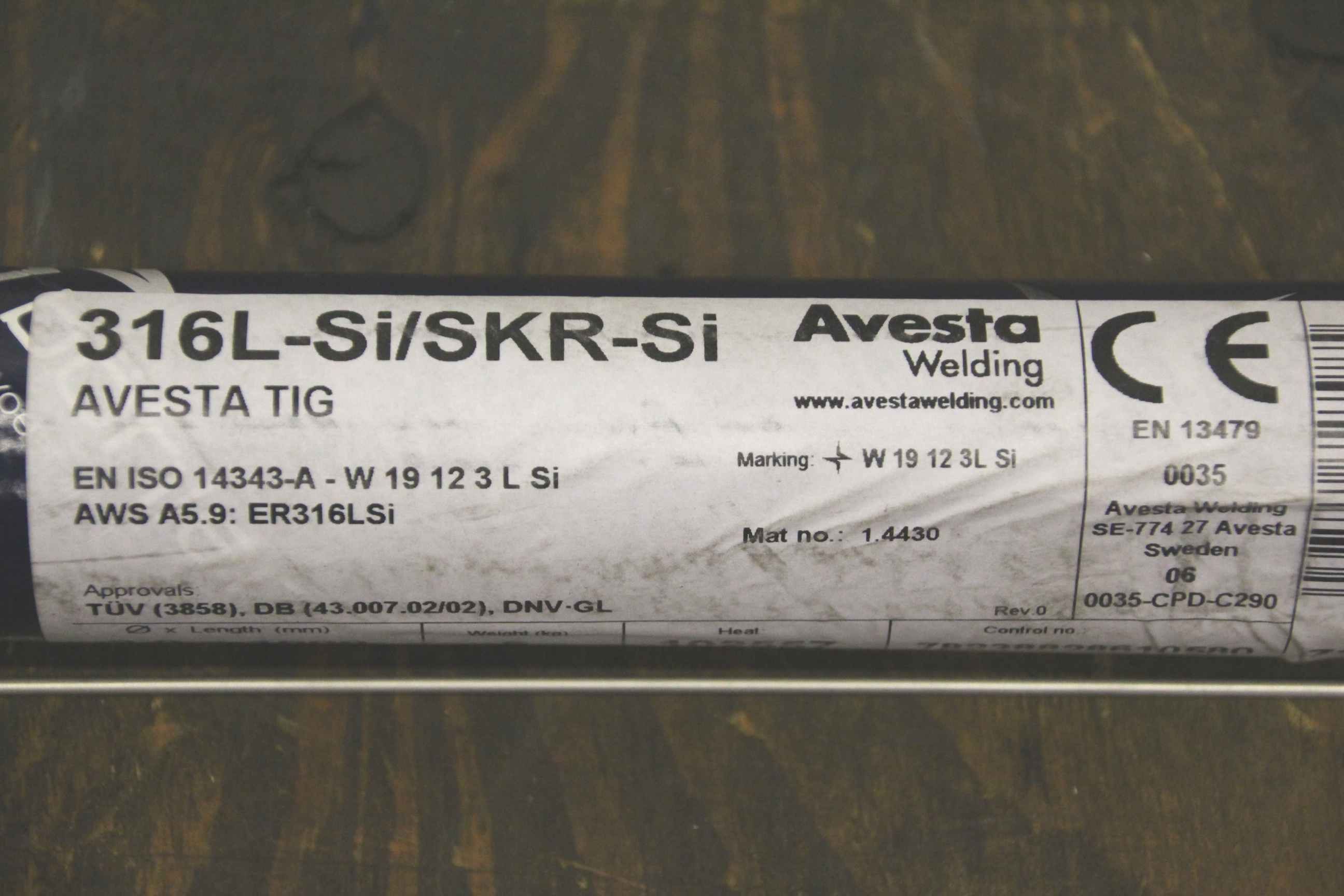 TIG welding rod, welding wire -Manufacturer: Avesta -Type: 316L-Si/SKR-Si Ø 2.0 x 1000 mm -Mat. no.: 1.4430 W 19 12 3L Si -Package dimensions: Ø 44 x 1010 mm -Weight: 5.1 kg