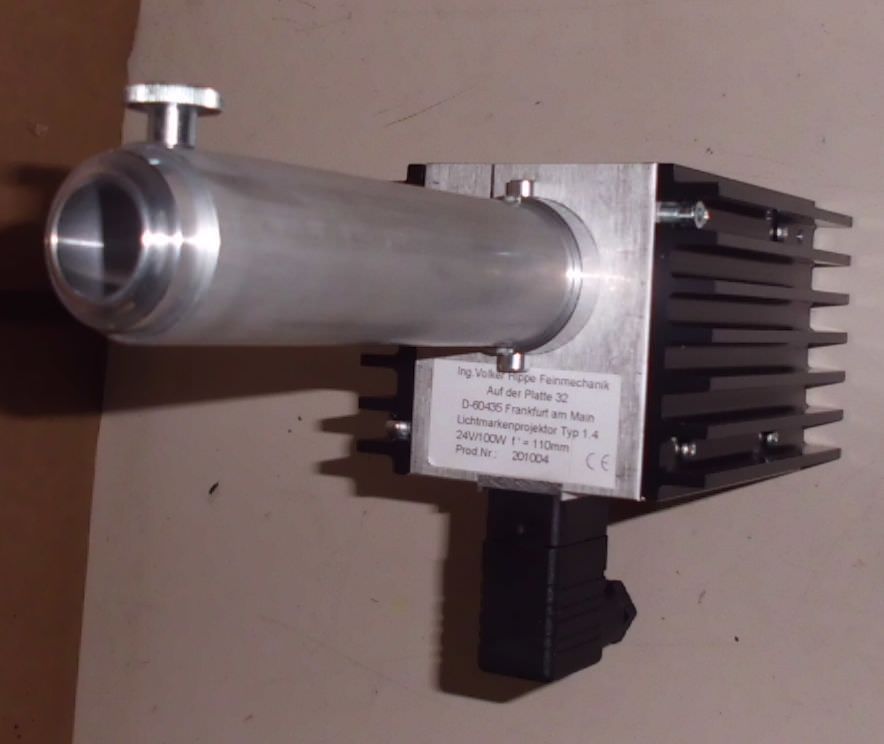 Light mark projector for flame cutting machines with drawing scanning -Type: 1.4 -Power: 24 V/100 W -f: 110 mm -Price: per piece -Number: 2x available -Dimensions: 230/93/H125 mm -Weight: 0.8 kg