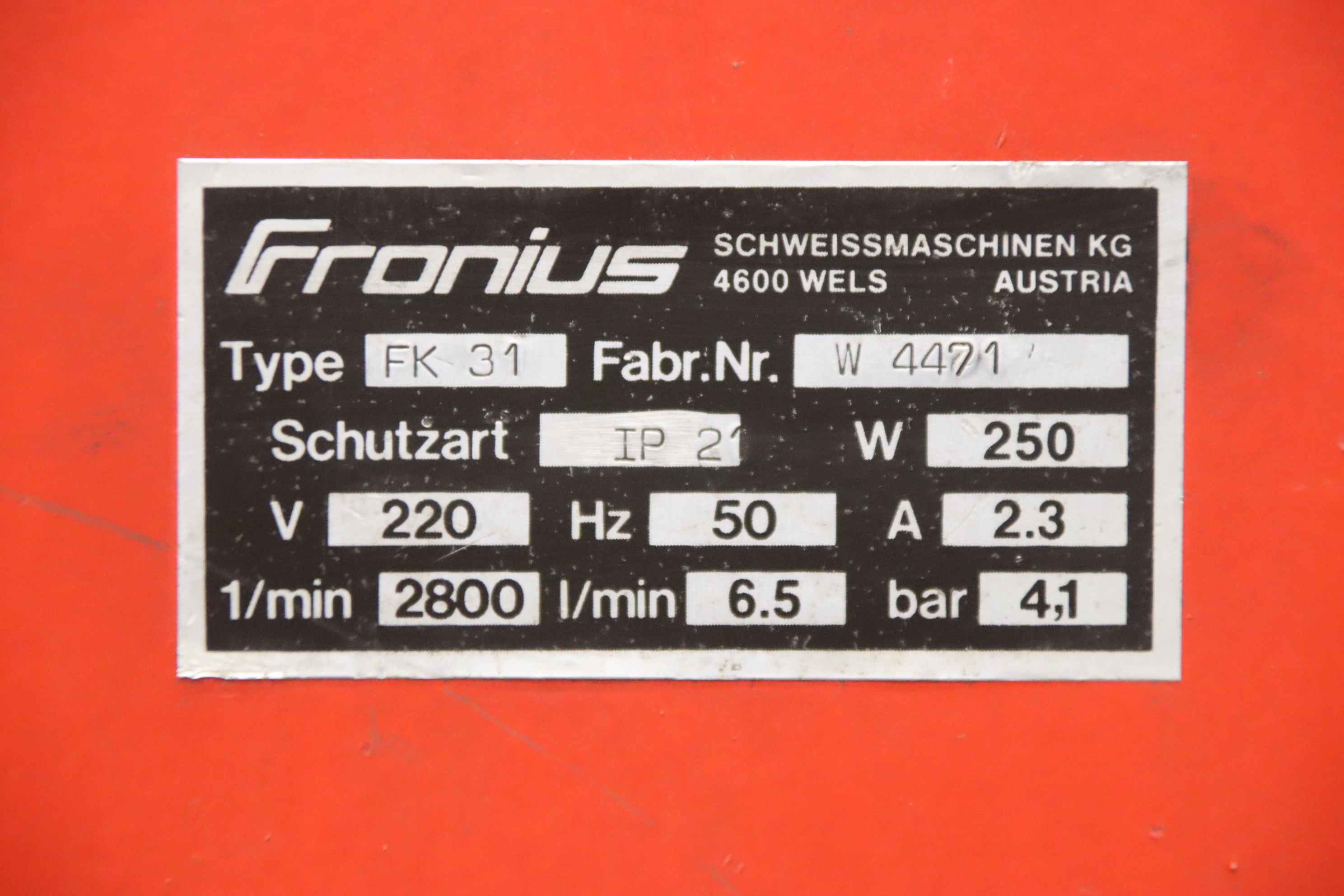 TIG welding machine, inverter welding machine, TIG welding machine, inverter welding machine, cooling unit, cooling unit -Manufacturer: Fronius, Cooling unit for Frowig 260 AC/DC TIG welding machine -Type: FK 31 -Flow rate: max. 6.5 l/min -Dimensions: 250/210/H650 mm -Weight: 19 kg