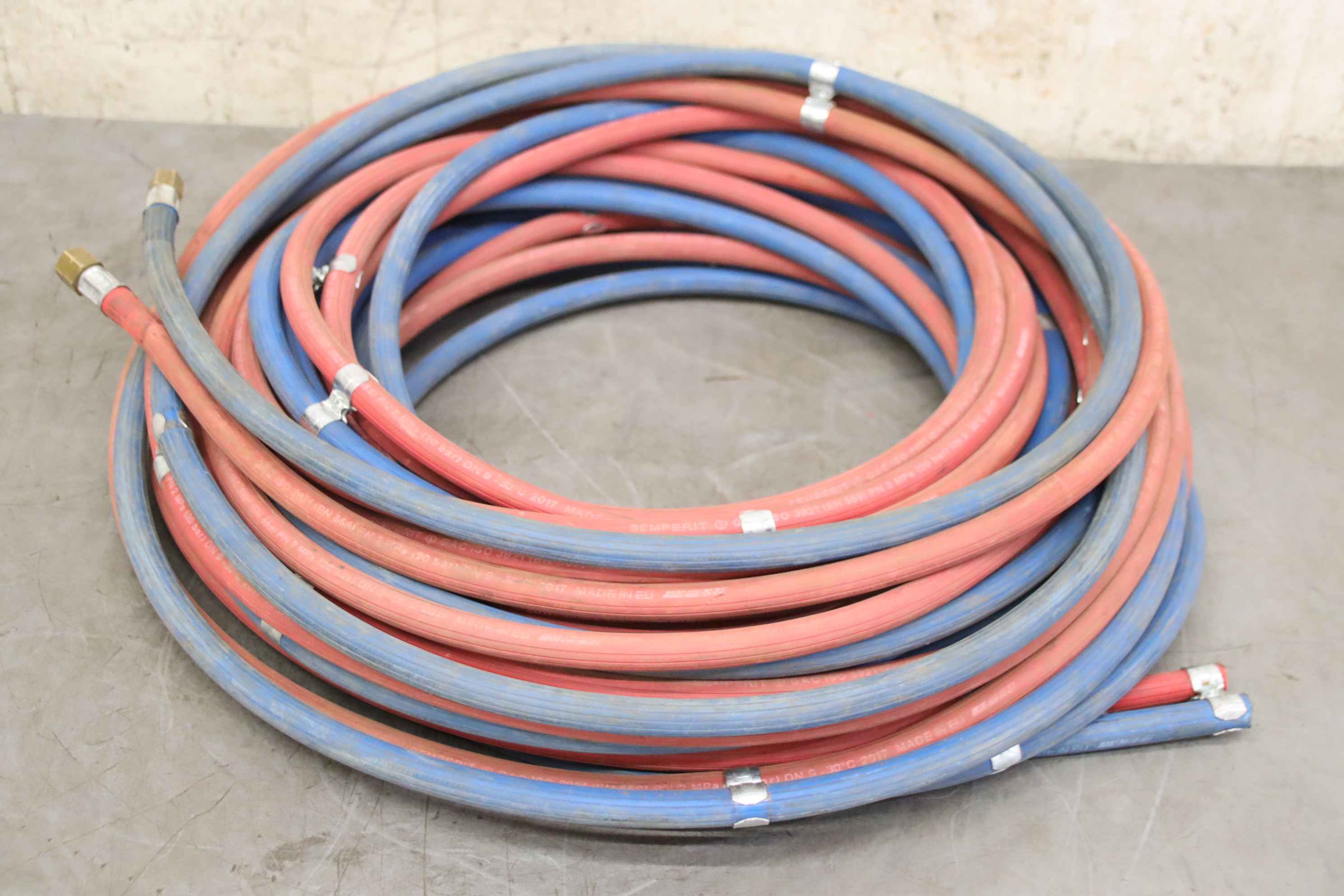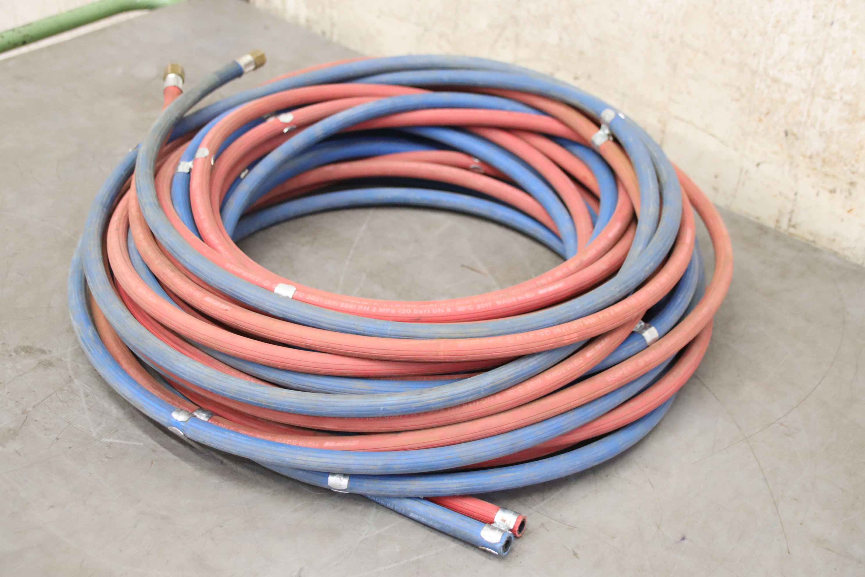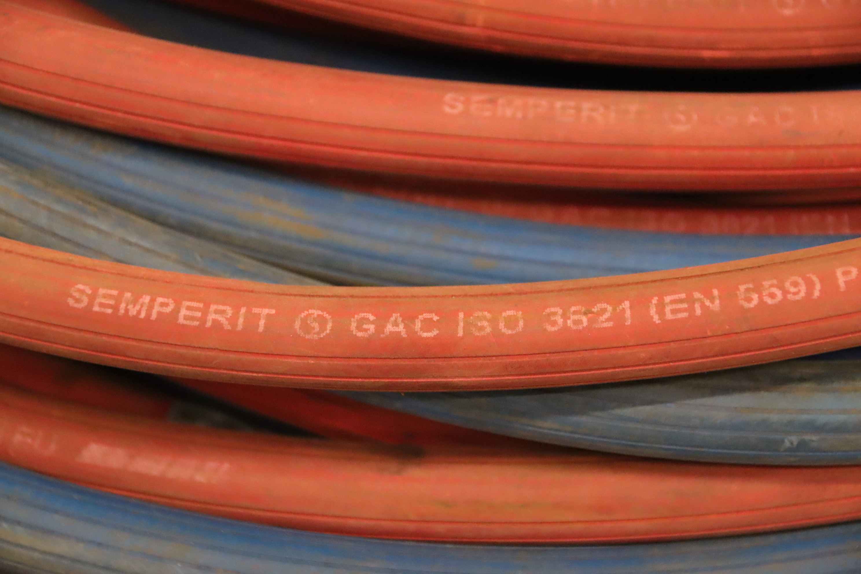 Flame cutting system, torch, oxyfuel cutting system, cutting torch, welding torch, hand cutting torch, welding kit, hose kit, twin hose, oxyfuel hose -Manufacturer: Semperit, Twin hose set -Type: Acetylene-Oxygen ISO 3821 PN2 DN9 -Length: 20 m, hose coupling only on one side -Dimensions: Ø 600 x 120 mm -Weight: 10 kg