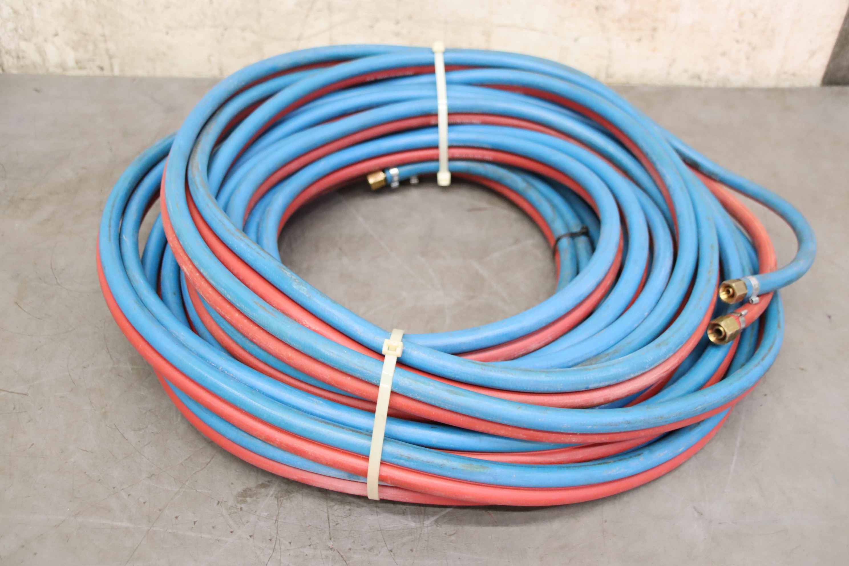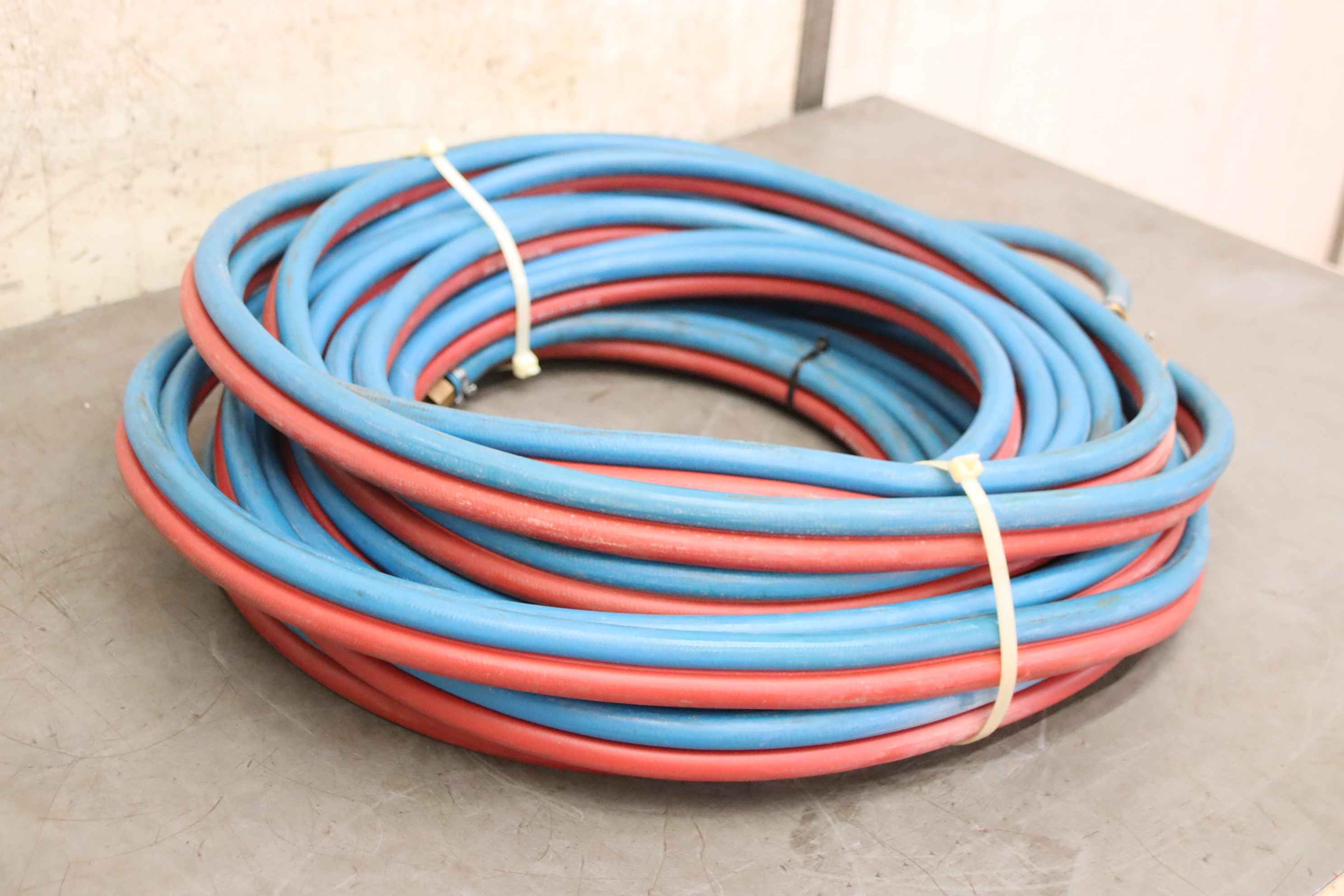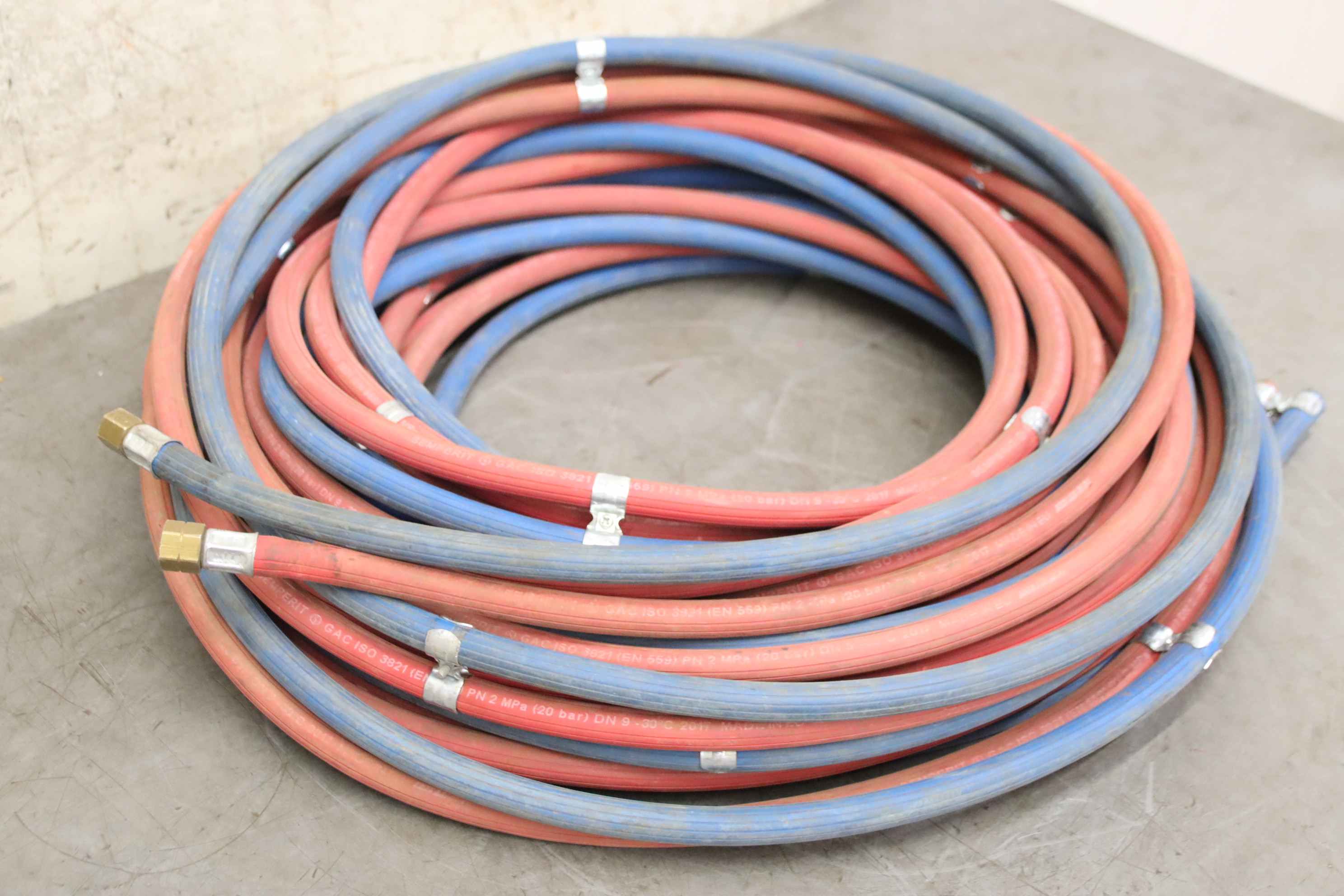 Flame cutting system, torch, oxyfuel cutting system, cutting torch, welding torch, hand cutting torch, welding kit, hose kit, twin hose, oxyfuel hose -Manufacturer: Semperit, Twin hose set -Type: Acetylene-Oxygen ISO 3821 PN2 DN9 -Length: 20 m, hose coupling only on one side -Dimensions: Ø 600 x 120 mm -Weight: 10 kg