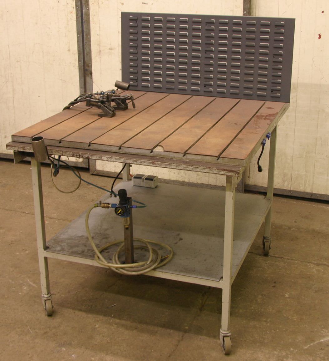 Clamping plate, welding table, straightening plate, T-slot plate -3D welding and work table -in aluminum for stainless steel processing -for positioning and finish welding with T-slot system -Mounting area: 1000x1000 mm -2x pneumatic clamping cylinders with ground connection -Dimensions: 1000/1400/H1300 mm