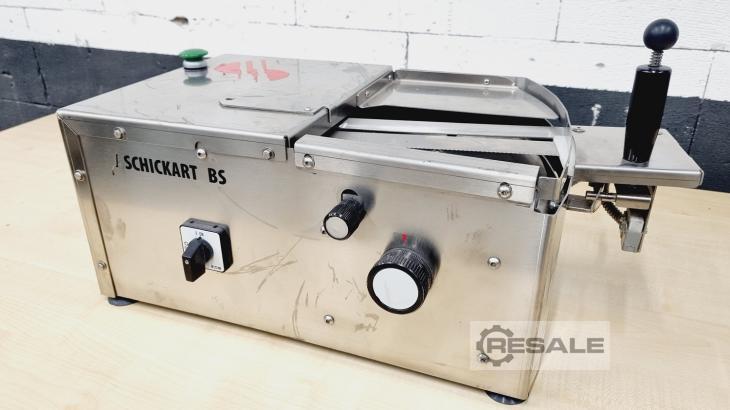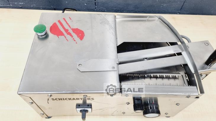 Rebanadora de pan y pretzel de la serie BS Modelo: BS 26 Máquina de sobremesa Altura de corte variable hasta 55 mm para cortar abierto o cortar en Acero inoxidable Conexión 220 V Dimensiones: 490 x 300 x 245 mm, ancho x fondo x alto Máquina usada limpiada ¡Más cortadoras en stock!