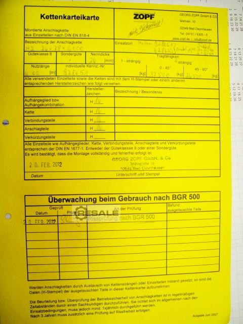2 cadenas de eslinga 2 - hebra Capacidad de carga 45 toneladas 2 - Mechón Longitud útil 5.000 mm Espesor nominal de la cadena: 32 mm Ensayos de fisuras según BGR 500 en 2012 nuevo