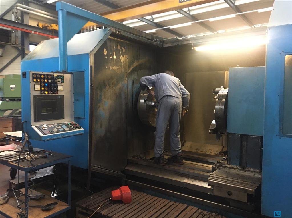 turning diameter:1600 mmturning length:3000 mmcentre height:800 mmturning diameter over bed:1600 mmturning diameter over bed slide:1400 mmturning dia. over face-slide:1200 mmmax. workpiece weight between centers:20 tospeeds:5,6 -800 1/mintransmission ratio:3 spindle bore:112 mmturret (x-stations):8 / VDI 60 travel -x axis:850 mmtravel -z axis:3020 mmrapid power traverse in X-and Z direction:6 / 10 m/minpower maindrive:46 kWweight of the machine ca.:22 to.dimensions of the machine ca.:7,2 x 4 (3,11) x 2,7 mtech-in lathe, flatbed,tailstock,8-pos. BARUFFALDI turret with 4 live tools, power 9kW,4-pos. BARUFFALDI square-headed turret horizontal,C-axis,3-jaw hydr. chuck SMW Autoblock KNCS 800/165, dia. 800mm,quick adjustment, power cylinder with 2 pressure clamping system,chipconveyor,coolant device,accessories