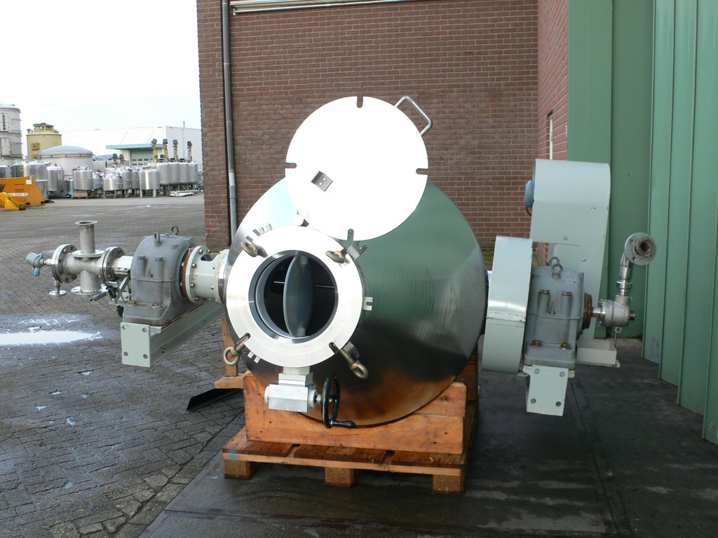 General SKU257M257 LocationBarneveld MakeLOEDIGE TypeFKM 600D No.14787 Pressure Working pressure5 Bar Main Features MaterialStainless steel Volume600 Ltr. Motor18.5 KW Specified Features - Powder turbo mixer Lödige mixercheck Capacity600 Ltr Useful capacity200 - 420 Ltr Trough sizesDIA. 800 x 1250mm Top connections2x DIA. 340mm Inspection hatch2x 450 x 380mm OutletDIA. 200mm With jacketcheck Max. temperature100 Glands air purgedcheck Motor18,5 KW, 380/660 Volt Speed mixing shaft187 Rpm MaterialStainless steel 1.4541 (321) Information Year of construction2001 Mounted on framecheck Floorspace3,7 x 1,8 M Total height1,9 M Weight2150 KGCatalysts & fillersFeed additivesOther pharmaceuticsCosmeticsFood additivesSugarAnimal feedOther feedConfectionerySolid pharmaceuticsDyes & pigmentsPowder turbo mixersMinerals & inorganicSpicesOther chemicalStarchTea, herbs & c ...