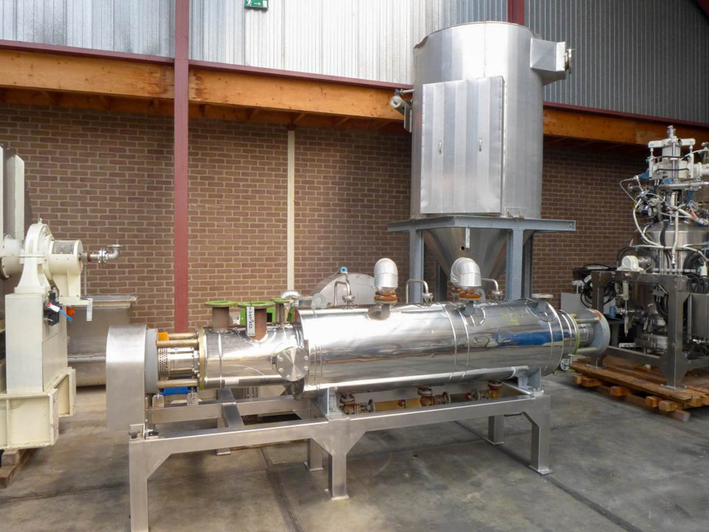 General SKU240P252 MakeVOMM TypeTurbodryer ES - 350 Year of construction1998 Mounted on framecheck Main Features MaterialStainless steel Volume1000 Ltr. Motor18.5 KW Specified Features - Paddle dryer Paddle dryercheck Turbo Continuouscheck Capacity±1000 Ltr. Trough sizesdia.350mm x2990mm Inletdia.125mm, (2x)dia.100mm, (2x)dia.25mm Outlet250x120mm With jacketcheck With mechanical sealcheck Motor18.5 KW, 380/660 Volt (EEx-d) MaterialStainless steel 1.4306 (304L) Information LocationBarneveld Weight1850+2500+520+800+570 kg total: 6240 kg ATEX compatiblecheck Extra Specificationsincluding: -Fan type r2352y2.  :volume 1500m3/hr, Motor 11 kW 380/660 Volt (EEx-d), -Faco heatexchanger type Risc. -Faco condensor, -Filter with total filter area 14.56m². -mechanicalseal sparesets Catalysts & fillersFeed additivesOther pharmaceuticsCosmeticsSugarAnimal feedOther feedConf ...