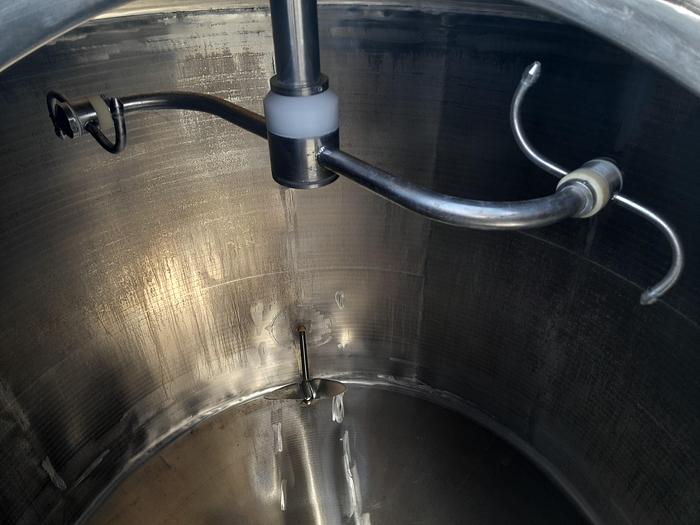 500 litros, número de stock: T4032, Litro: 500, material: acero inoxidable resistente a ácidos AISI 316, en stock: sí, cantidad en stock: 1 unidad, artículo: depósito, de pie: 3 unidades. patas, Inferior: Cónica, Doble camisa: Sí, Aislada: Sí, Revestimiento exterior: Totalmente soldado de acero inoxidable, Tapa del depósito: Tapa semibisagra, Agitador: Sí, 2 piezas, Tipo de agitador: Ancla con raspado y hélice, Colocación del agitador: Desde arriba, Anclaje del motor: 0,55 kW - 230/400 Voltios - 56 rpm., Hélice del motor: 1,1 kW - 220/380 Voltios - 1080 rpm., Diámetro interior: 800 mm., Diámetro exterior: D 920 mm., altura total: H 2000 mm., Fabricante: Kofa