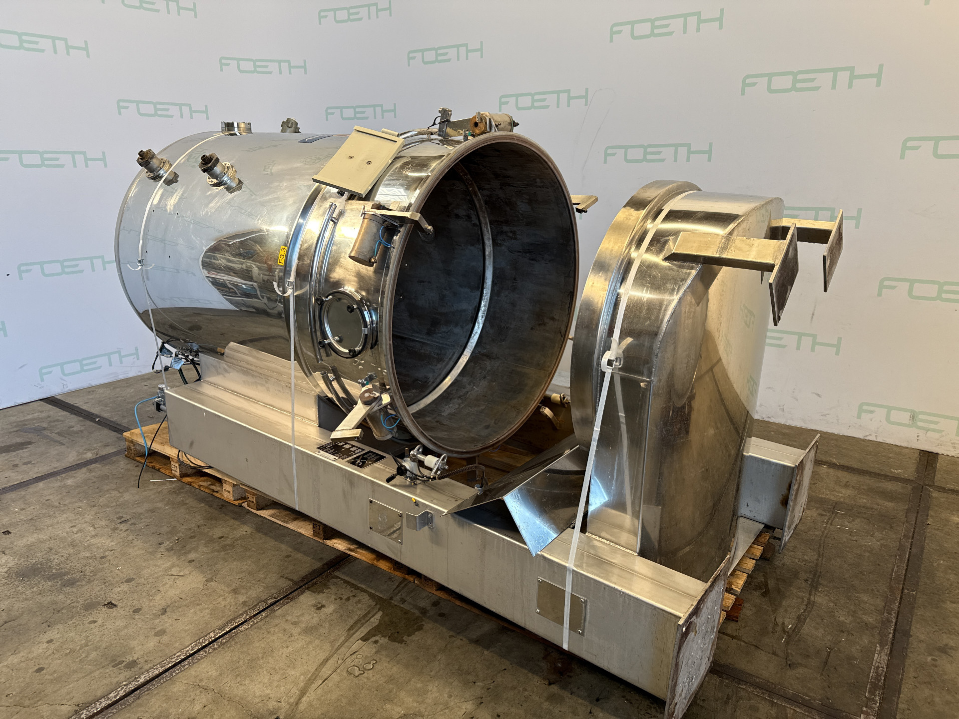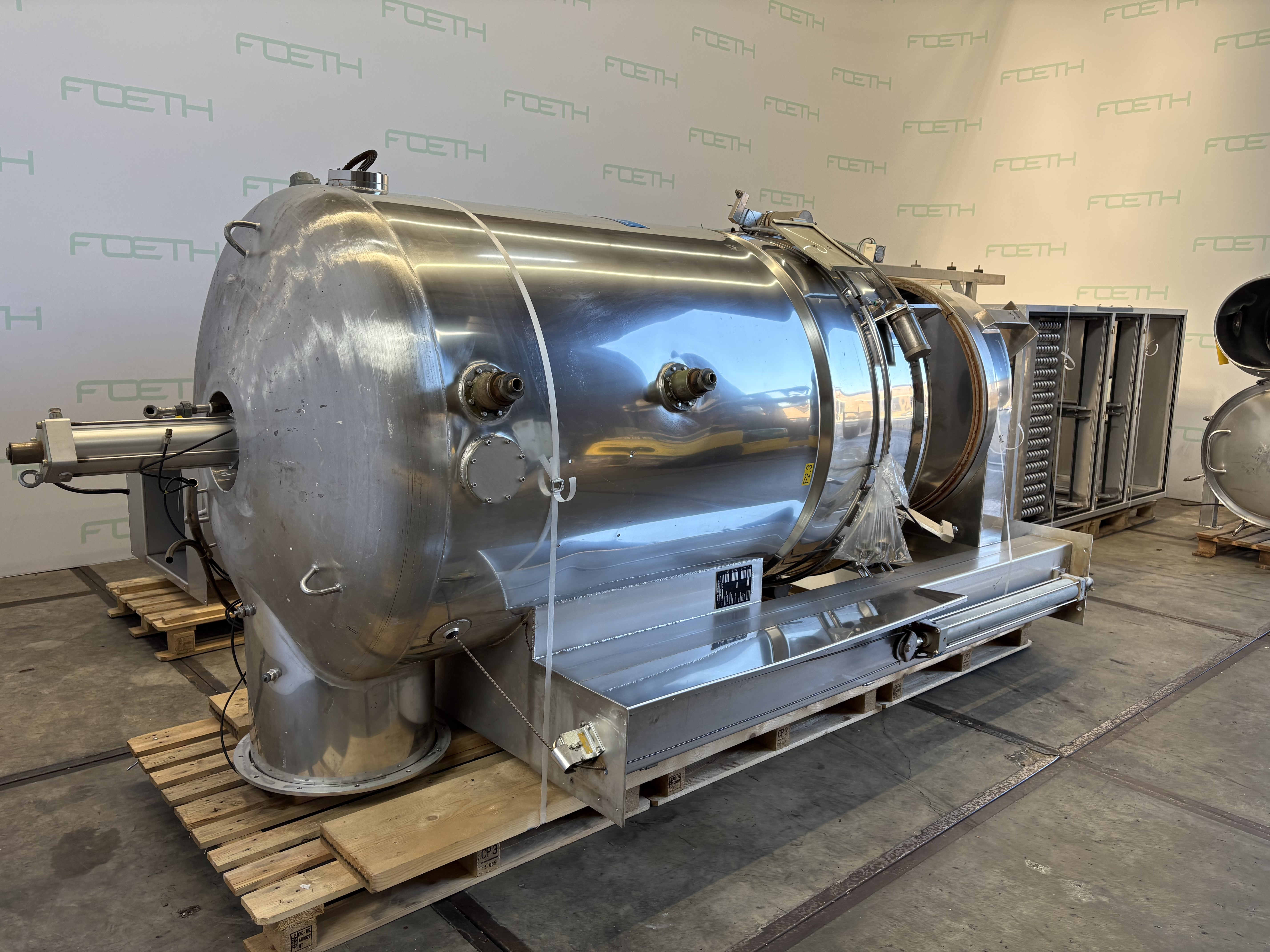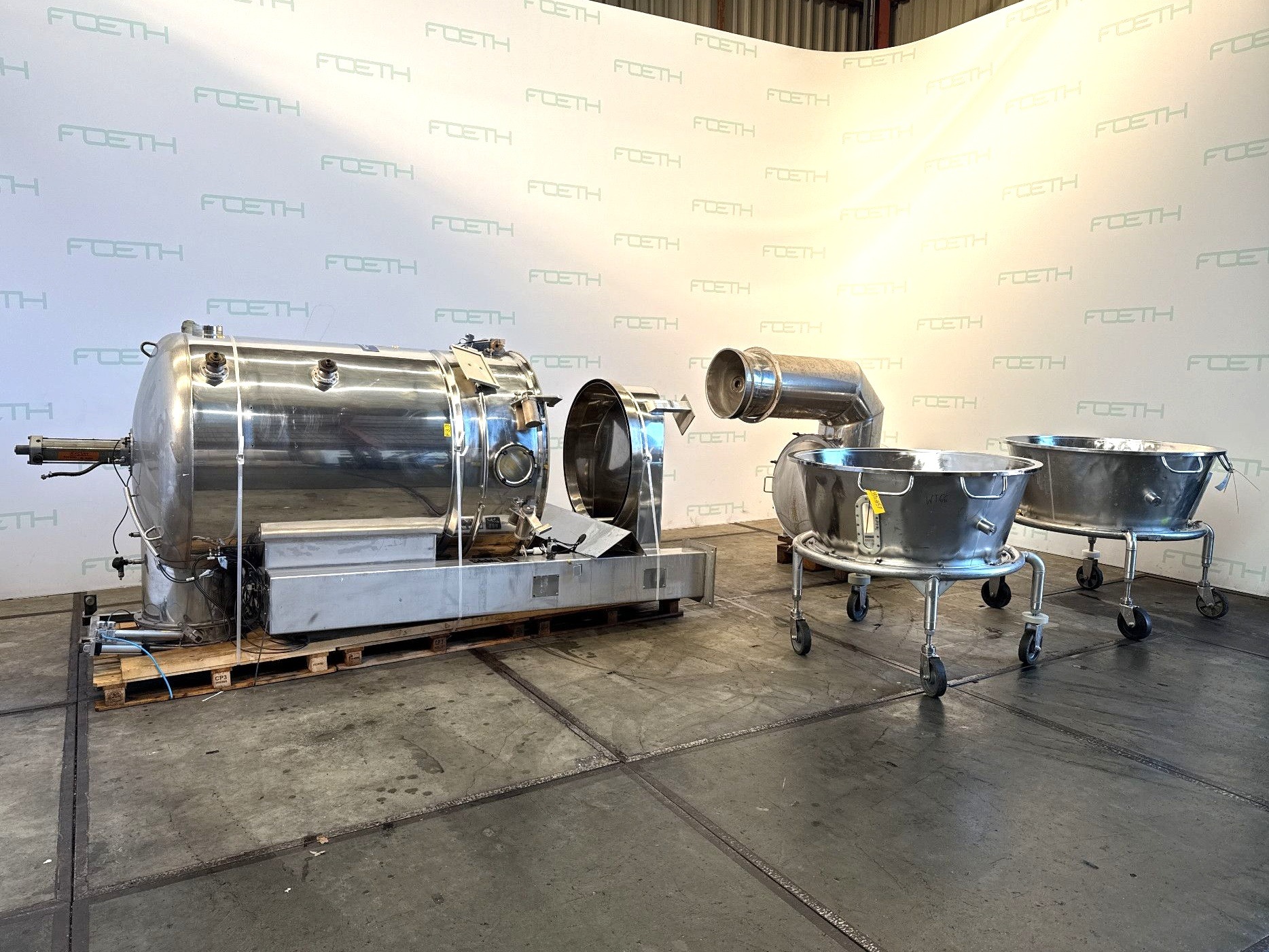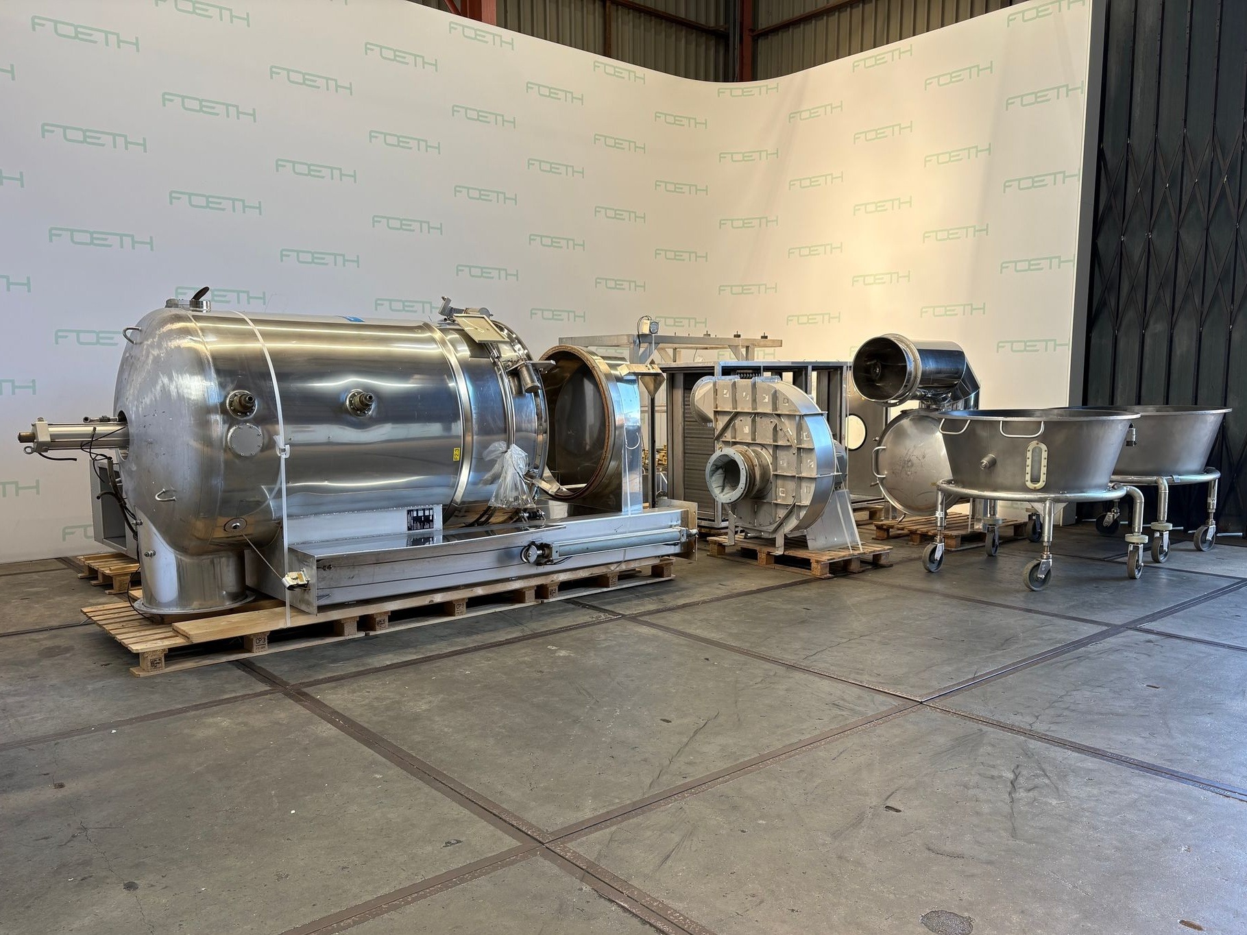 General SKU397X1155 MakeNiro-Aeromatic LocationBarneveld TypeT6 Main Features MaterialStainless steel Volume540 Ltr. Motor20 KW Specified Features - Fluid bed dryer batch Fluidbeddryercheck With pancheck 2x With pan mounted on wheelscheck Capacity540 l. Pan sizesø 1280 x 550 mm Can be heated by steamcheck With fancheck Capacity2 m3/s Motor2,0 kW, 380 V With dust filtercheck Filter surface21 m²: Fine dust filter: 38,6 m² MaterialStainless steel 1.4301 (304), Stainless steel 1.4435 (316L) Information No.929057 Year of construction1992 With switchgearcheck Extra Specifications Heating capacity: :208.3 kW Steam overpressure: :4 bar Max. allowable operating overpressure: :6 bar Test overpressure: :7.8 bar Max. steam consumption: :356 kg/h Average steam consumption: :190 kg/hFluid bed dryers batchAeromaticDryers > Fluid bed dryers batchBrand > Aeromati ...