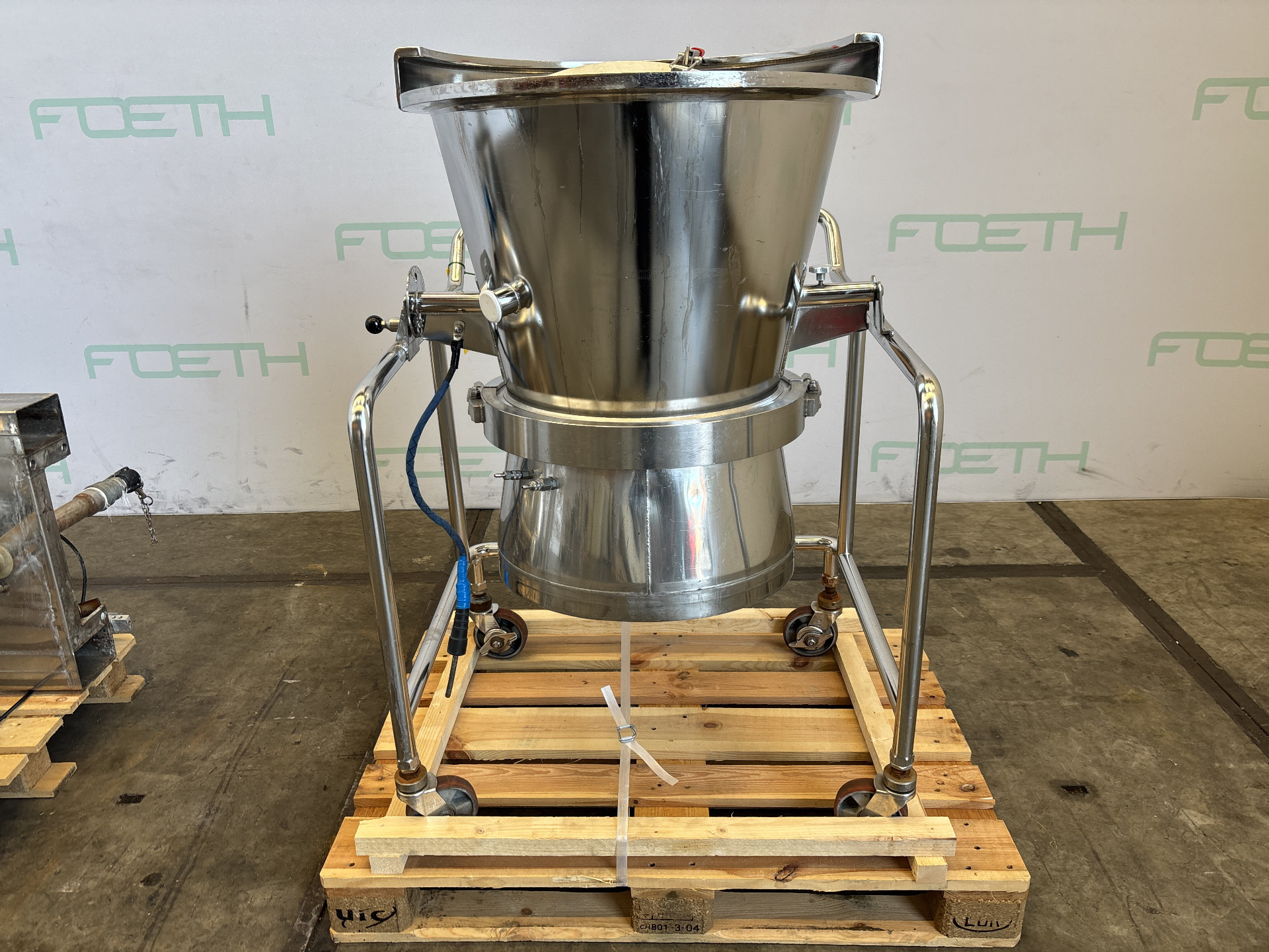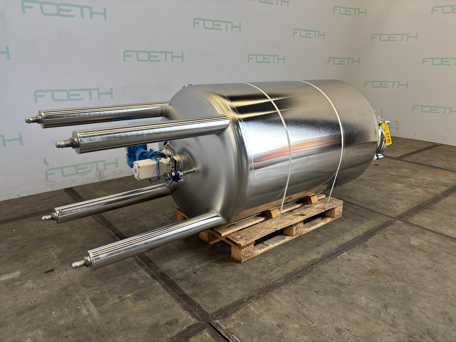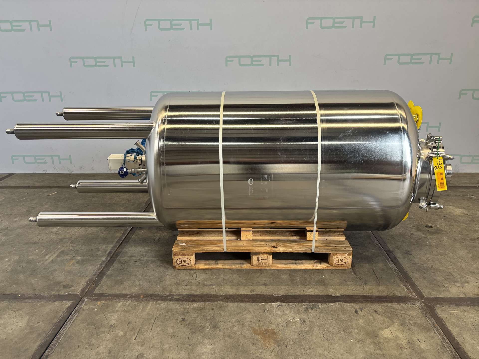 General SKU327X686 MakeM. Roth LocationBarneveld CEcheck Type1300 l. Pressure Working pressure4 Bar Vacuum possiblecheck Number of vertical pressure tanks1 Main Features MaterialStainless steel Volume1300 Ltr. Motor0.37 KW Pressure4 Bar Vacuumcheck Specified Features - Stirring vessel MaterialStainless steel 1.4404 (316L) Closed stirring vesselcheck Capacity1300 l. Vessel sizesø 950 x 1800 mm Dished bottomcheck Dished top sidecheck ManholeDN400 Top connectionscheck Outletcheck DN25 with valve Max. temperature144 °C With propellor stirrercheck Motor0,37 kW, 220/380 V, 1350 rpm Information No.B652 Year of construction2008 Mounted on legscheck Floorspace1,00 x 1,00 m Total height2,80 m Weight430 kgStirring vesselsNew arrivalsM.rothStirring vessels > Stirring vesselsNew arrivalsBrand > M.roth What you can expect from Foeth: -- Machine is in working condi ...