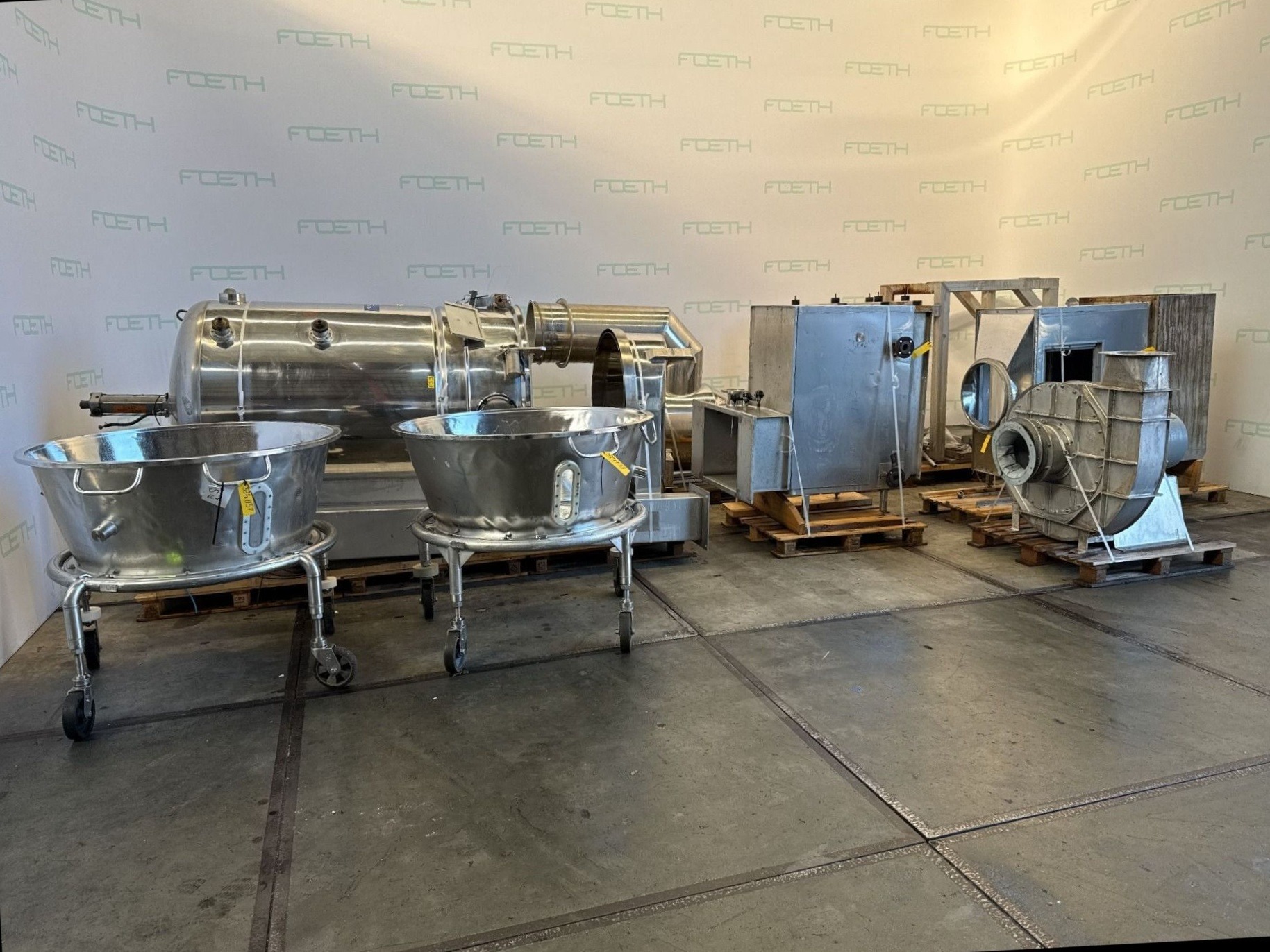 General SKU397X1156 MakeNiro-Aeromatic TypeT6 spez No.909003 Year of construction1990 LocationBarneveld Main Features MaterialStainless steel Volume540 Ltr. Motor20 KW Specified Features - Fluid bed dryer batch Fluidbeddryercheck With pancheck 2x With pan mounted on wheelscheck Capacity540 l. Pan sizesø 1280 x 550 mm Can be heated by steamcheck With fancheck Capacity2 m³/s Motor2,0 kW, 380 V With dust filtercheck Filter surface21 m²: Fine dust filter: 38,6 m² MaterialStainless steel 1.4301 (304), Stainless steel 1.4435 (316L) Information Extra Specifications Heating capacity: :208.3 kW Steam overpressure: :4 bar Max. allowable operating overpressure: :6 bar Test overpressure: :7.8 bar Max. steam consumption: :356 kg/h Average steam consumption: :190 kg/hFluid bed dryers batchAeromaticDryers > Fluid bed dryers batchBrand > Aeromatic What you can e ...
