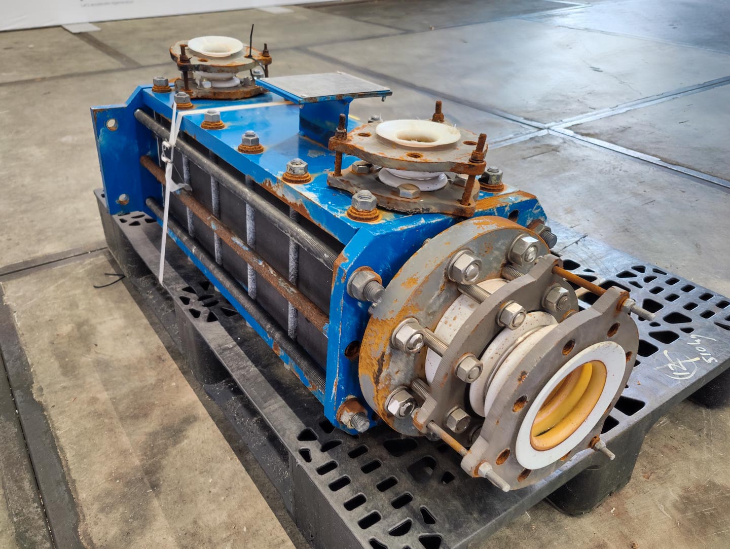 General SKU356T1073 MakeGab Neumann LocationBarneveld TypeH-B-4,8 Pressure Vacuum possiblecheck Working pressure shell3 Bar Vacuum possible shellcheck Working pressure tubes3 Bar Tubular vacuum possiblecheck Main Features Shell (Material)Graphite Tube (Material)Graphite Surface4.8 m2 Specified Features - Shell and tube heat exchanger MaterialGraphite Heat exchangercheck Horizontalcheck Heating surface4.8m² Tube capacity21ltr. Tube length830mm Max. temperature-10/+165°C Shell capacity19ltr. Shell diameter480mm Shell length830mm Max. temperature-10/+165°C Shell connectionsDia: 50mm (2x) Cover connectionsDia: 150, 50mm(2x) Information No.9391-7211 Year of construction1988 Floorspace1,1x0,6m Total height0,8m Weight400kgCatalysts & fillersFeed additivesPaper & otherSolventsDetergent & surf.Other pharmaceuticsCosmeticsOrganicsE-waste & metalFood additivesS ...