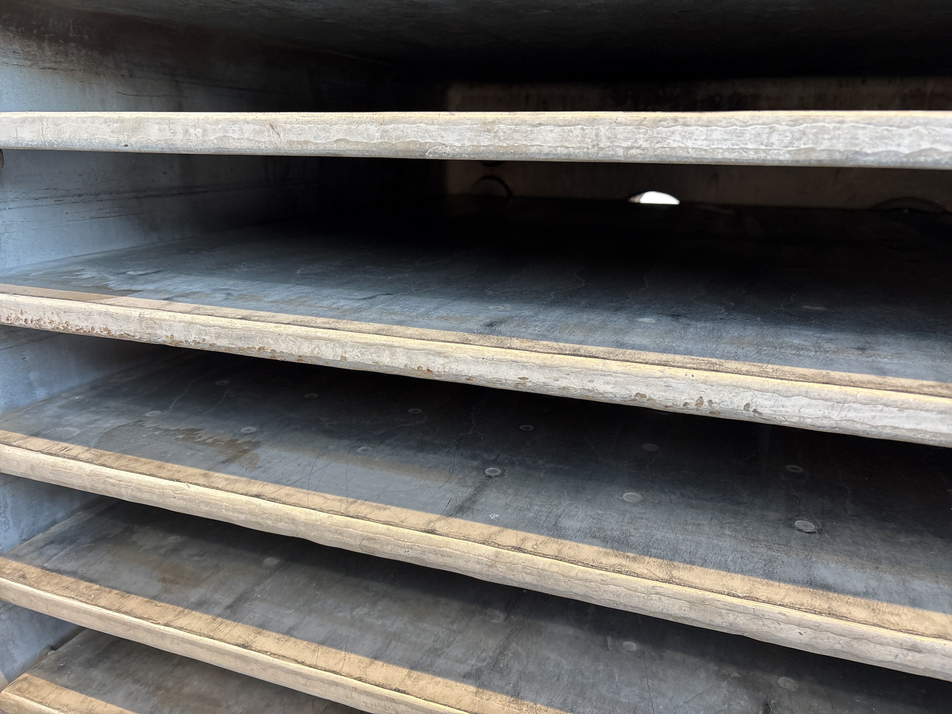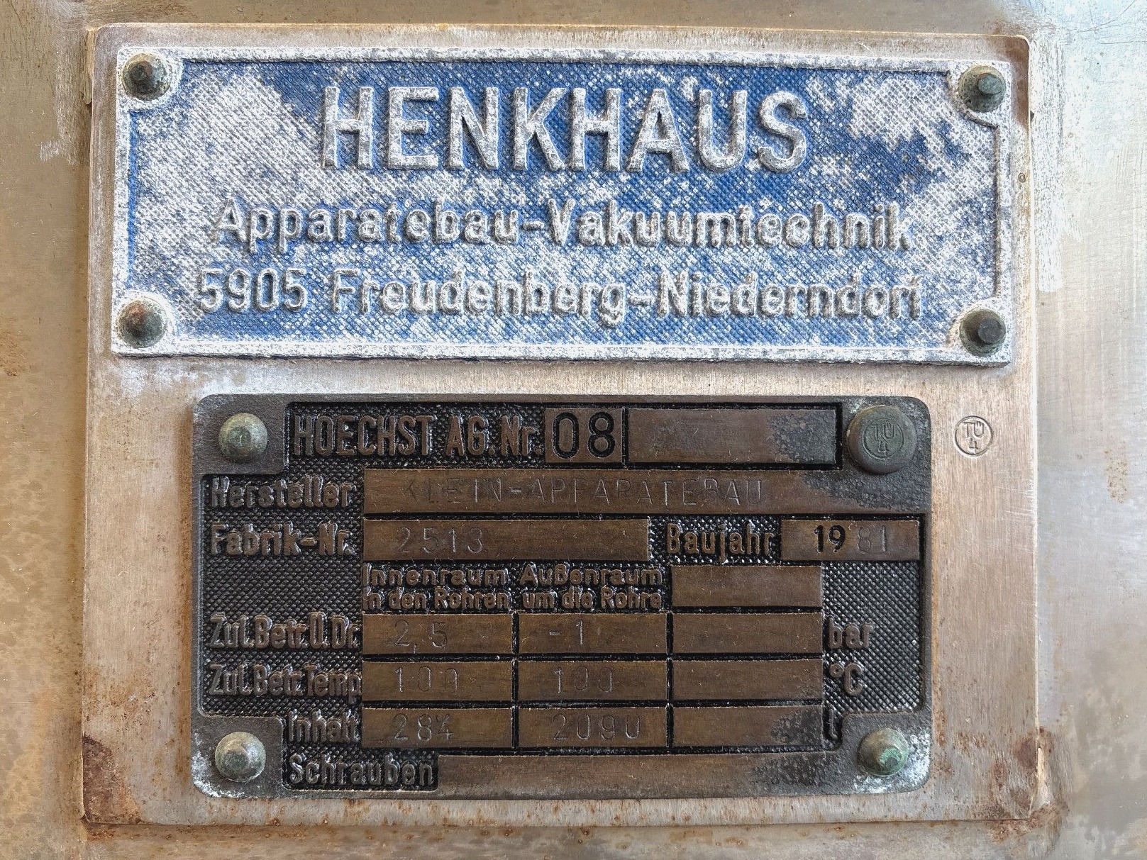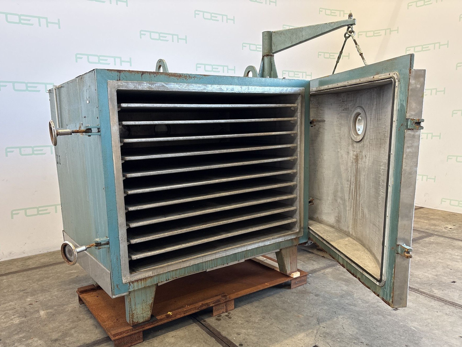 General SKU397X1126 LocationBarneveld Pressure Working pressure1 Bar Vacuum possiblecheck Working pressure jacket2.5 Bar Main Features MaterialStainless steel Volume2090 Ltr. Surface18 m2 Specified Features - Tray dryer Tray dryercheck Stainless steel housingcheck Stainless steel trayscheck Heating surface16,2 m² (18 m²) Drying chamber capacity2090 l. Drying chamber sizes1718 x 1130 x 1305 mm Max. temperature100 °C With jacketcheck Max. temperature100 °C Number of trays9 (10) Tray sizes1650 x 980 x 23 mm Distance between the trays96,6 mm Max. temperature100 °C With 1 doorcheck ConnectionsDN125 Without vacuum pumpcheck MaterialStainless steel 1.4571 (316Ti) Information MakeHenkhaus / Klein Machine number2513 Year of construction1981 Floorspace1,8 x 1,93 m Total height2,7 m Weight4500 kg Extra SpecificationsPressure inside pipes 2,5 bar, volume 284 ...