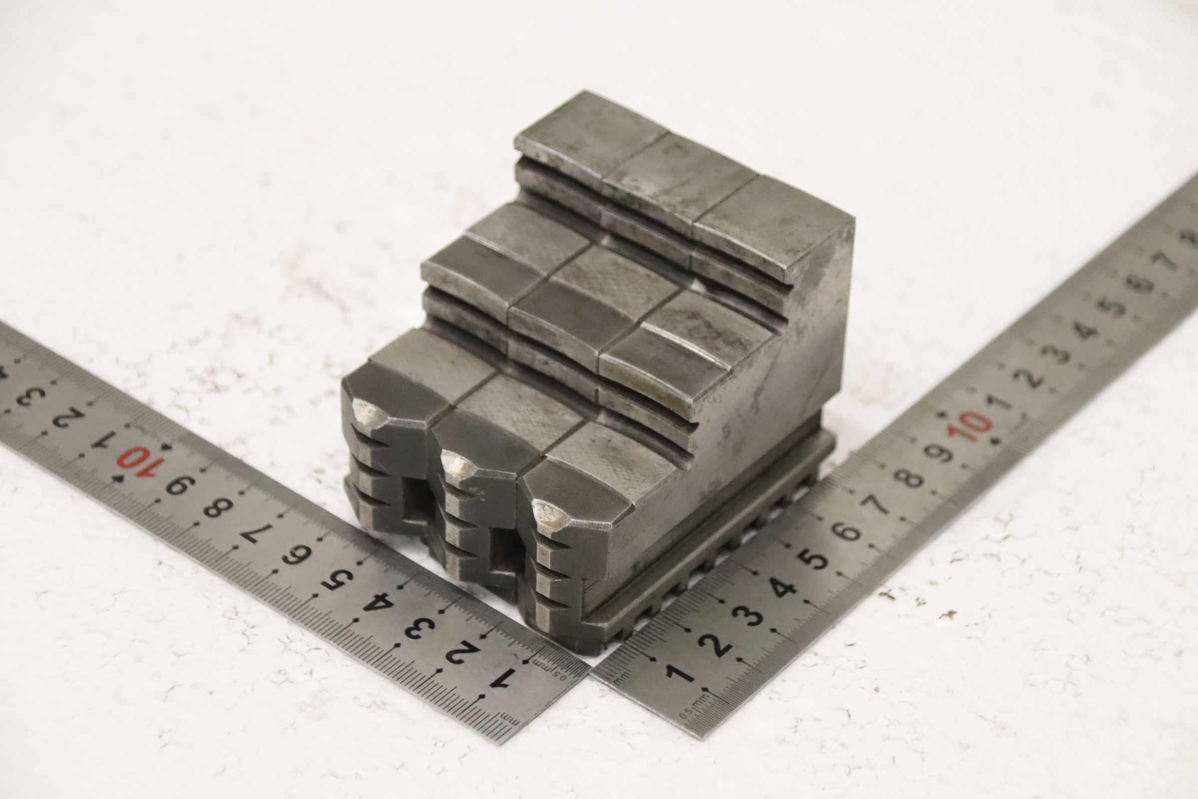 Interchangeable jaws, top jaws, three-jaw chucks, segment jaws, clamping jaws, stepped block jaws, stepped top jaws, block jaws, base jaws, interchangeable jaws, wedge bar chucks, interchangeable jaws, power chucks -Top jaws: hard top jaws for wedge bar chucks, helical teeth -Jaw width: 45 mm -Dimensions: see photo technical drawing -Overall dimensions: 167/135/H93 mm -Weight: 10.7 kg