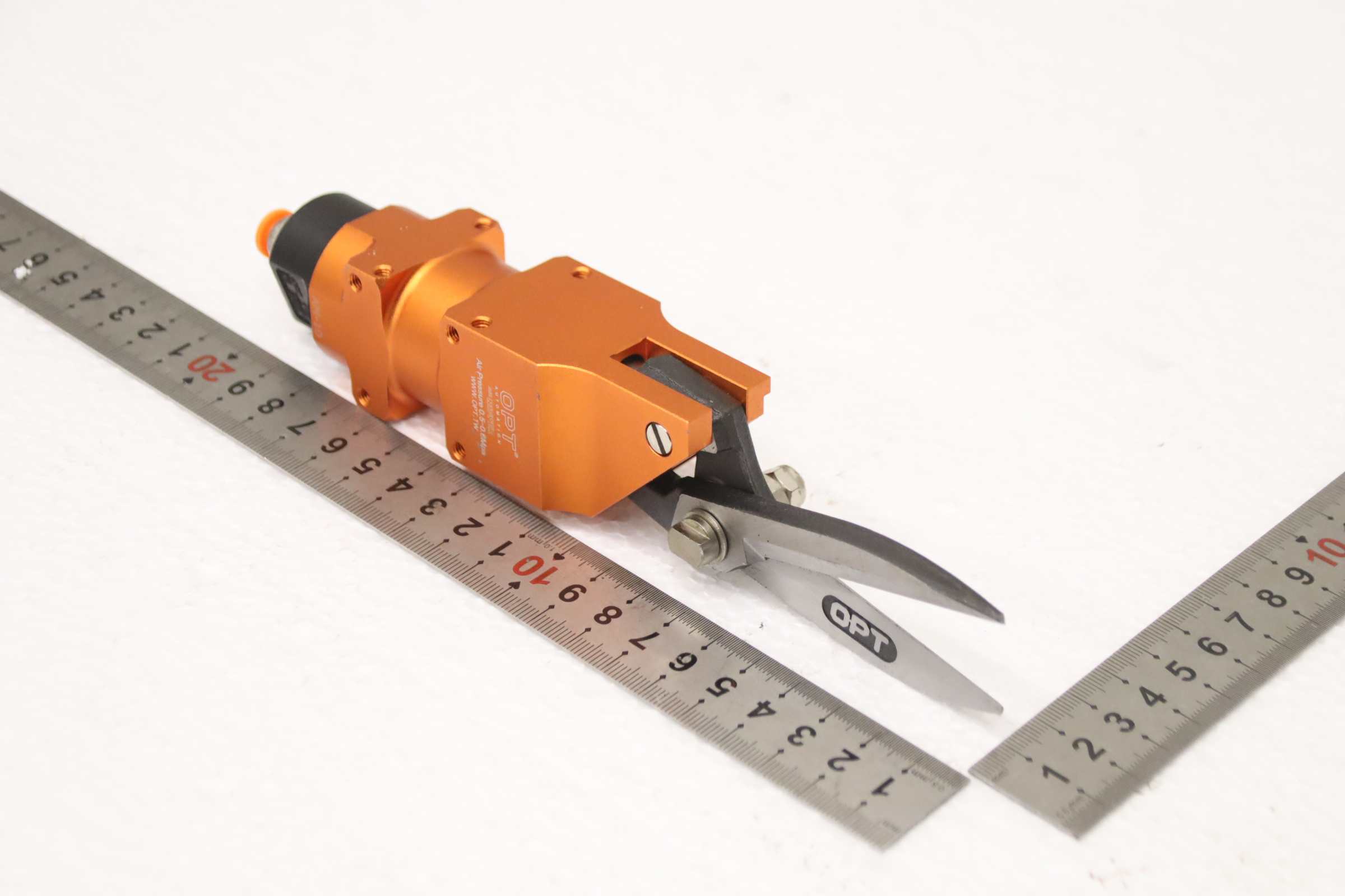 Scissors, pneumatic scissors, air cutters, wire cutting scissors -Manufacturer: OPT, Air cutter, Pneumatic wire cutting shears -Type: AM-10 -Cutting blade: OPT cutting length approx. 46 mm, see photo -Quantity: 1 pair of scissors available -Overall dimensions: 210/35/H40 mm -Weight: 0.3 kg