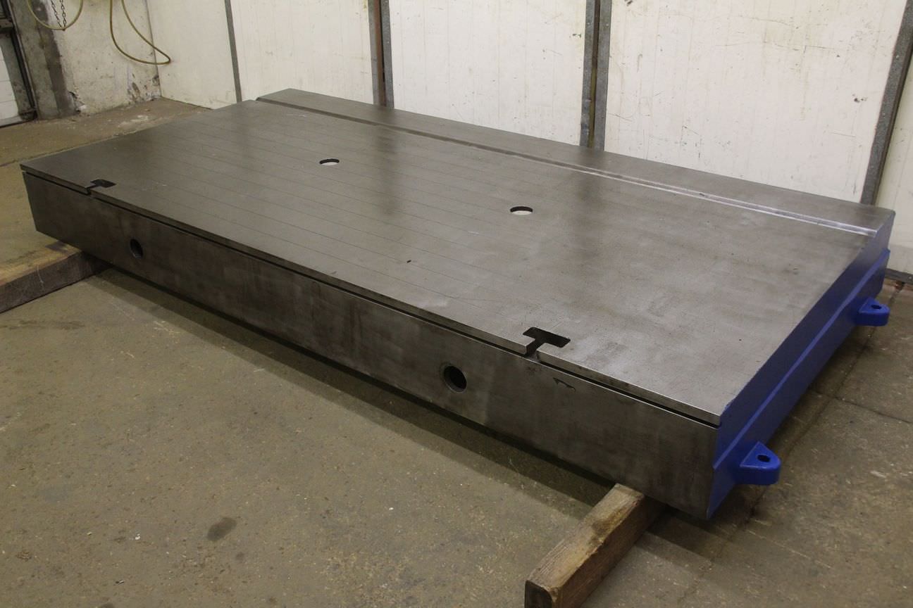 Mounting plate, scribing/marking plate, measuring plate, measuring table, welding table, welding table, straightening plate -Plate: has a prism and scribing lines -1x Front side: with T-slot -Width: 1495 mm -Length: 3000 mm -Height: 302 mm -Sheet thickness: 80 mm -Plate: is equipped with supporting ribs -Number: 2x plates available -Price: per piece -Transport dimensions: 3170/1580/H302 mm -Weight: 2100 kg/piece