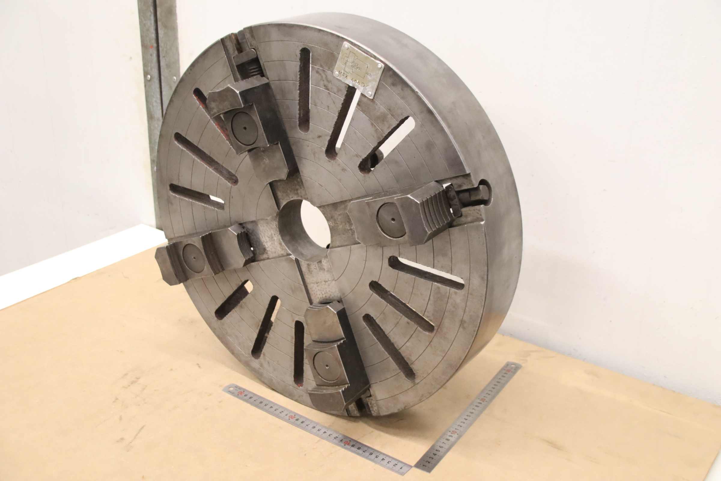 Faceplate, faceplate chuck, four-jaw chuck, face turning chuck -Faceplate: Chuck size Ø 560 mm -Bolt circle: Ø 170 mm -Through hole: Ø 90 mm -Reference: Short cone 8 (Ø 136-139 mm) -Dimensions: Ø 560 x 200 mm -Weight: 77.3 kg