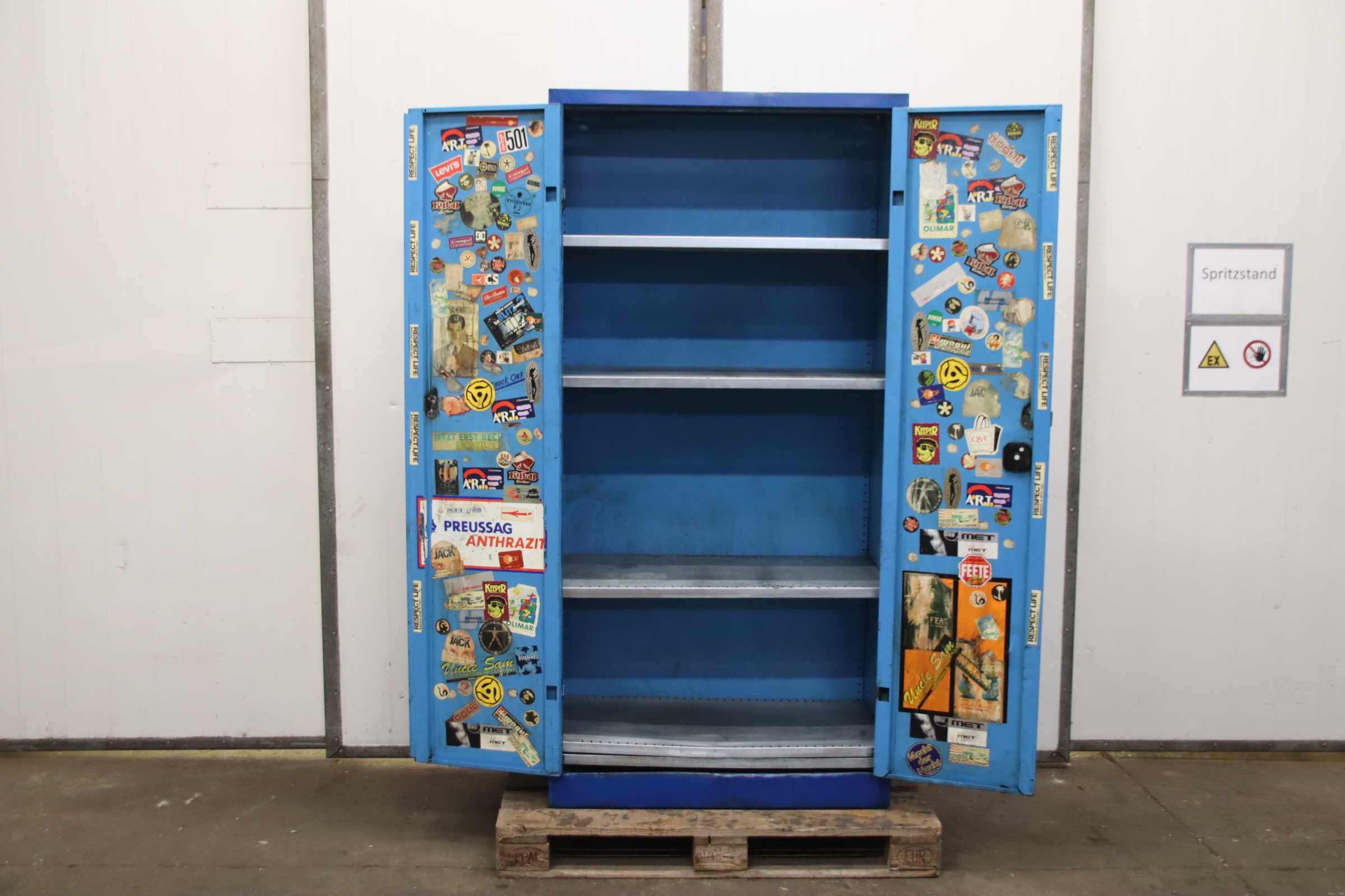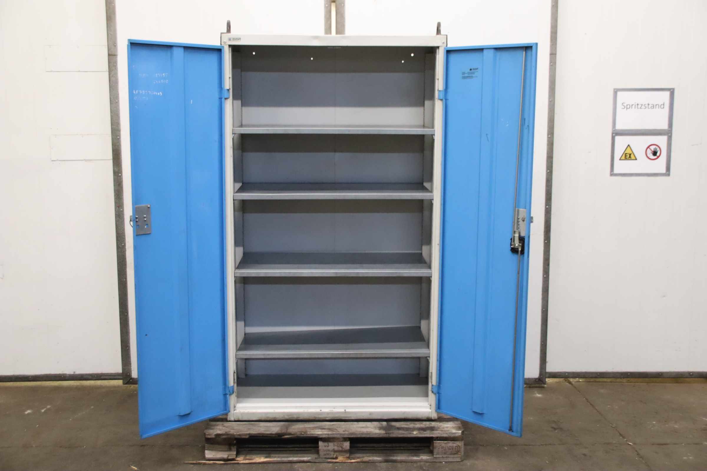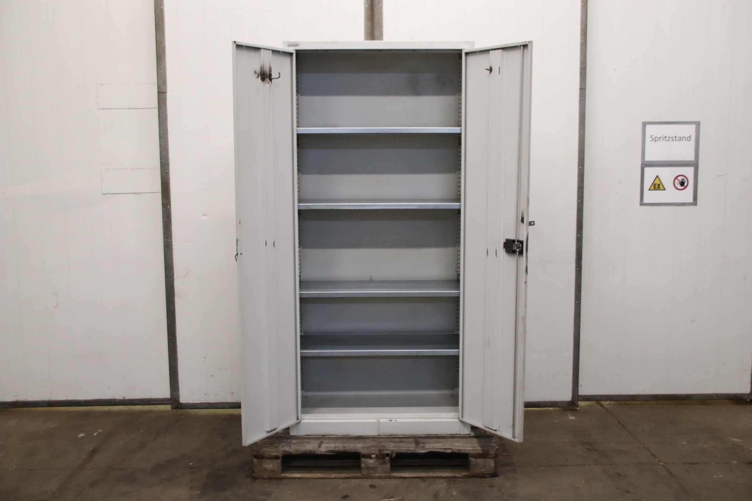 Drawer cabinet, tool cabinet, steel cabinet, workshop cabinet, steel locker -Tool cabinet: Steel cabinet with 2 shelves -Width: 935 mm -Depth: 410 mm -Height: 2010 mm -Door: lockable, without key -Weight: 59 kg