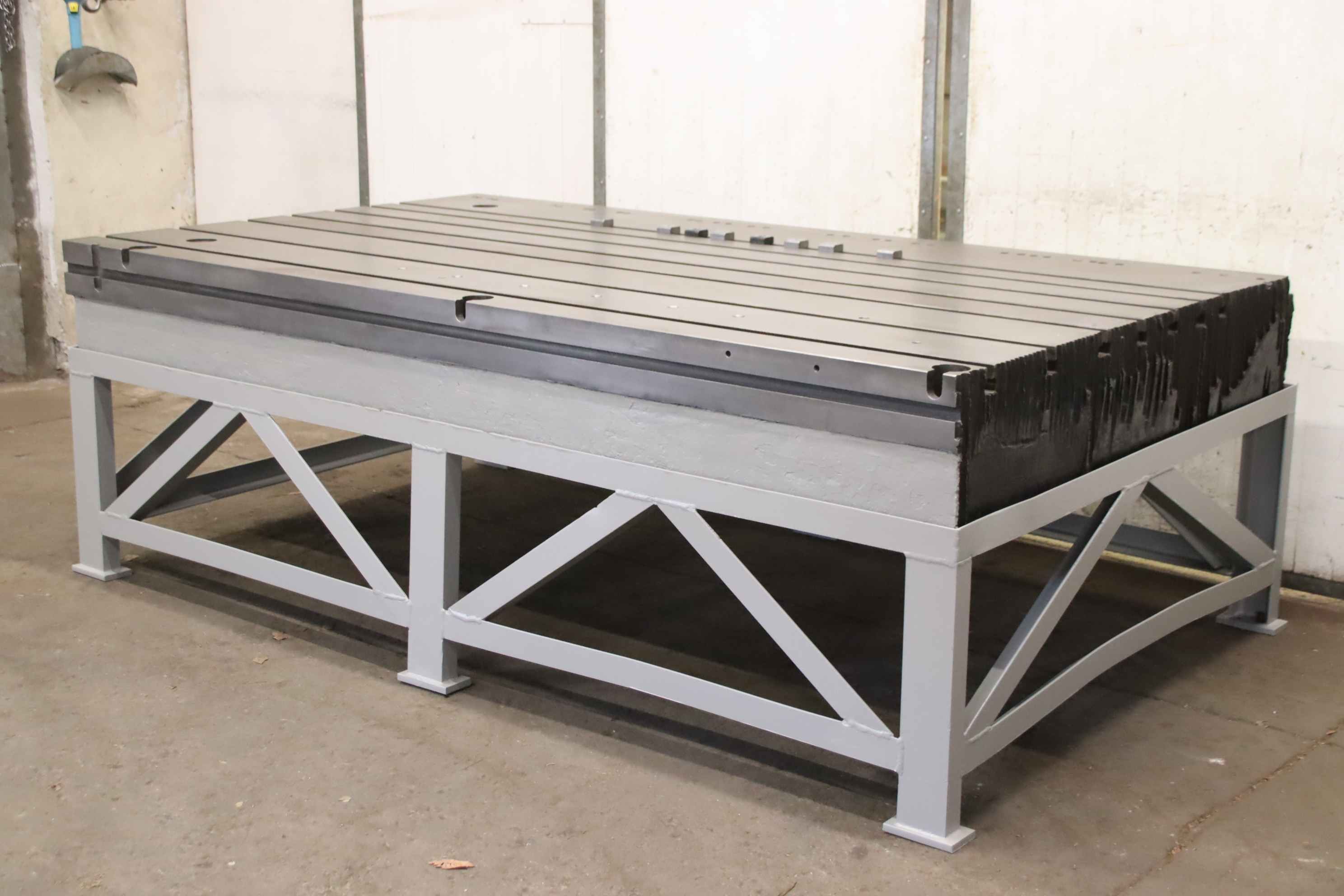 Clamping plate with T-slots, plate field, welding table, welding table, T-slot plate, clamping plate, marking plate, measuring plate, measuring table, straightening plate, marking plate-T-slot plate: clamping plate with solid base frame-Length: 2495mm-Width: 1435mm-Plate: with support ribs-Groove width: 28 mm-Groove spacing: 152 mm-Total dimensions: 2545/1515/H835 mm-Weight: 2860 kg