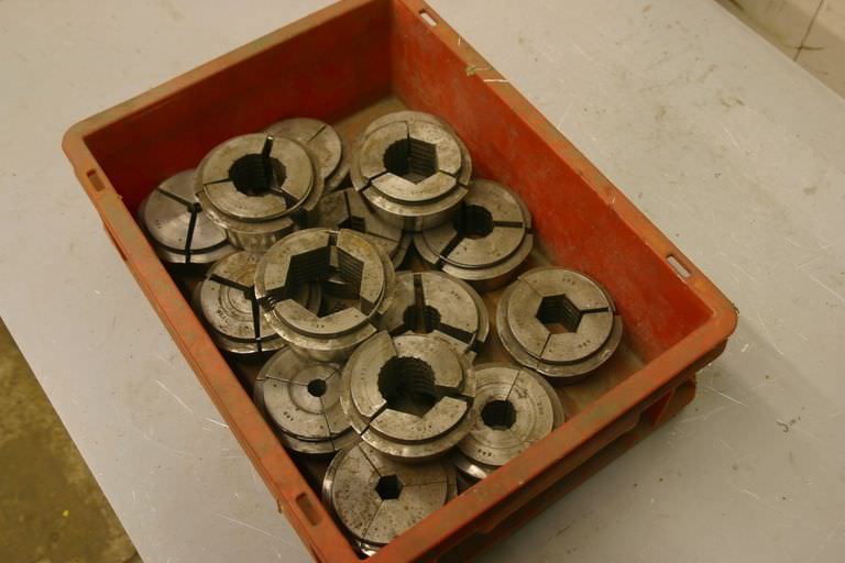 Collet collet sleeves, collet chuck, tool holder, tool holder, milling holder, milling tool, clamping sleeves -Number: 15x collet chucks different diameters and hexagon -Outer diameter recess: Ø 75 mm -Cone: approx. Ø 90/70 mm -Cone length: 40 mm -Weight: 22 kg