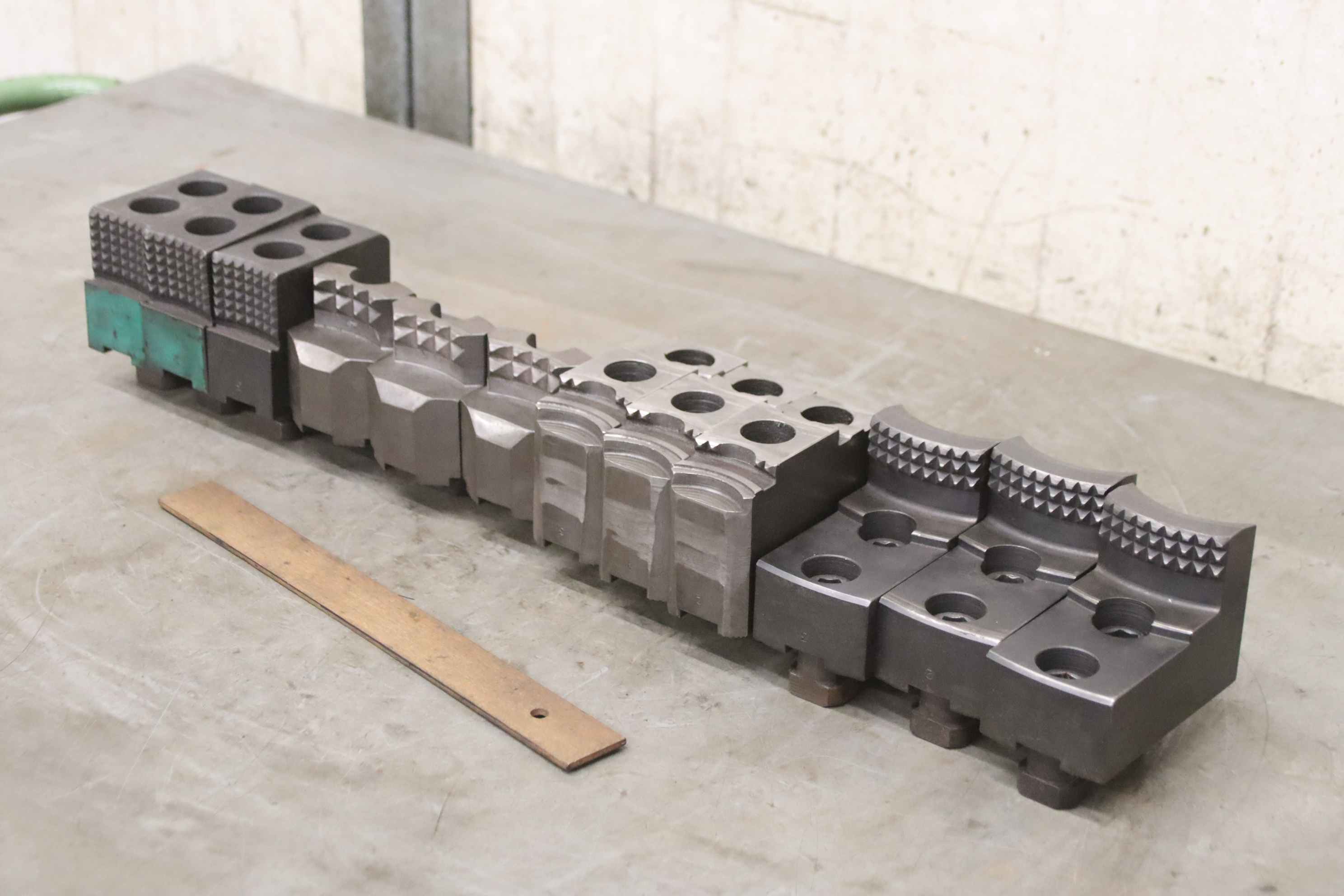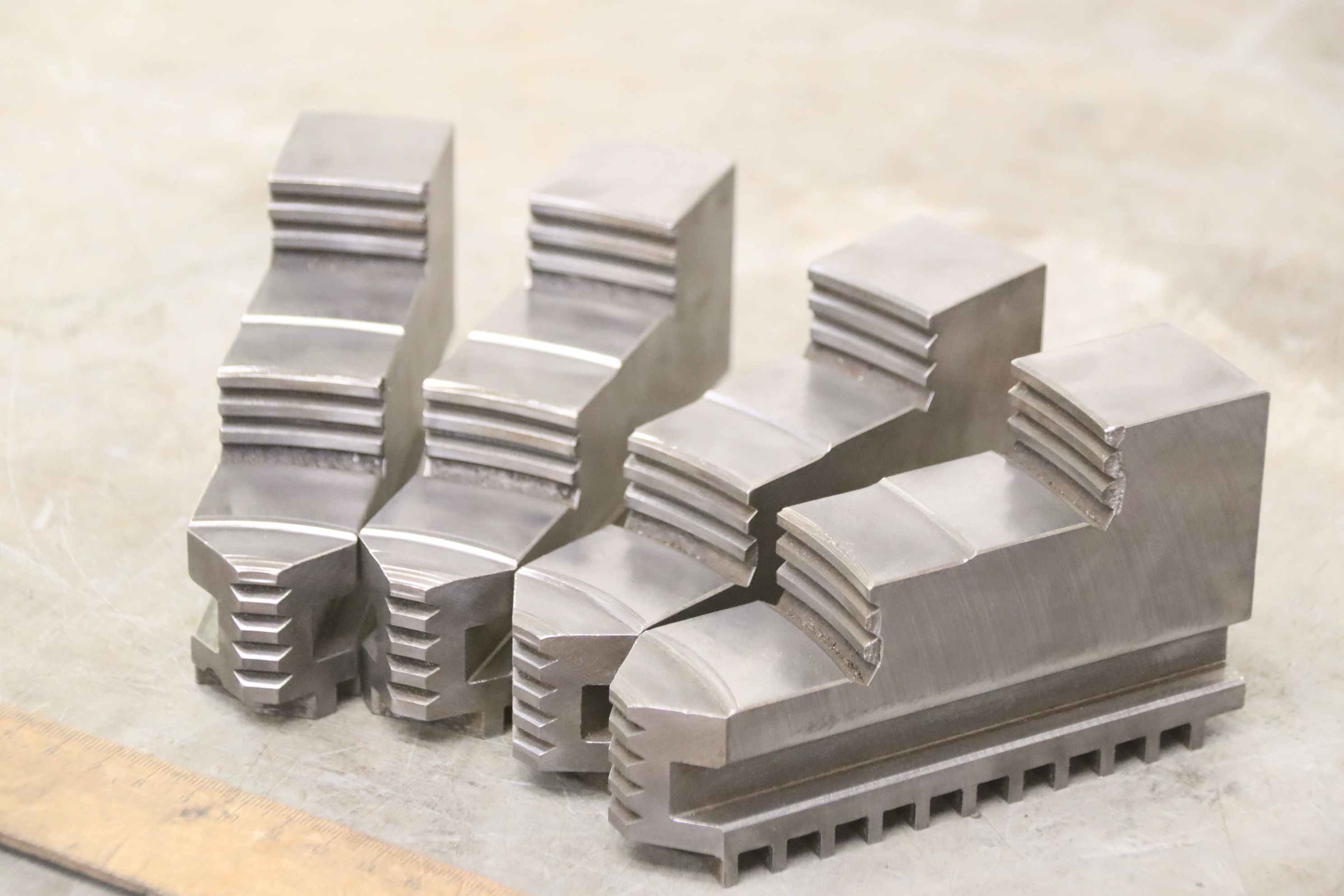 Interchangeable jaws, top jaws, three-jaw chuck, segment jaws, clamping jaws, stepped block jaws, stepped top jaws, block jaws, base jaws, 4-jaw set-Top jaws: rotary jaw set for power chucks, 4 sets-Jaw width: mm-Dimensions: see photo techn. drawing-Price/delivery: complete-Transport dimension: 330/230/H105 mm-Total weight: 27.5 kg