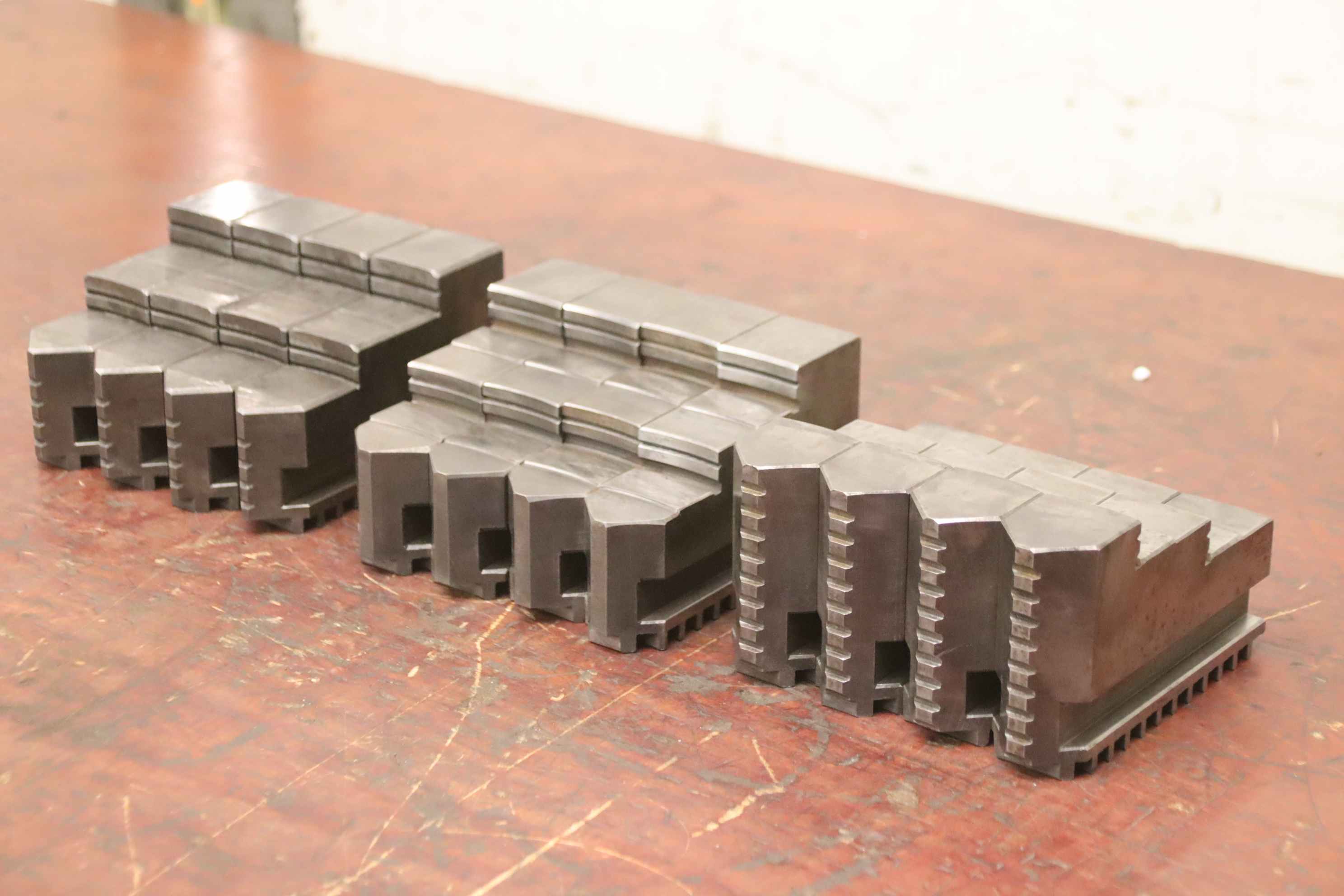 Interchangeable jaws, top jaws, three-jaw chucks, segment jaws, clamping jaws, step block jaws, step top jaws, block jaws, base jaws, 4-jaw set-Top jaws: 4-piece rotary jaw set, 3 sets-Jaw width: 34 mm-Dimensions: see photo technical drawing-Price/Sale: only complete-Total dimensions: 410/130/H80 mm-Total weight: 21.3 kg