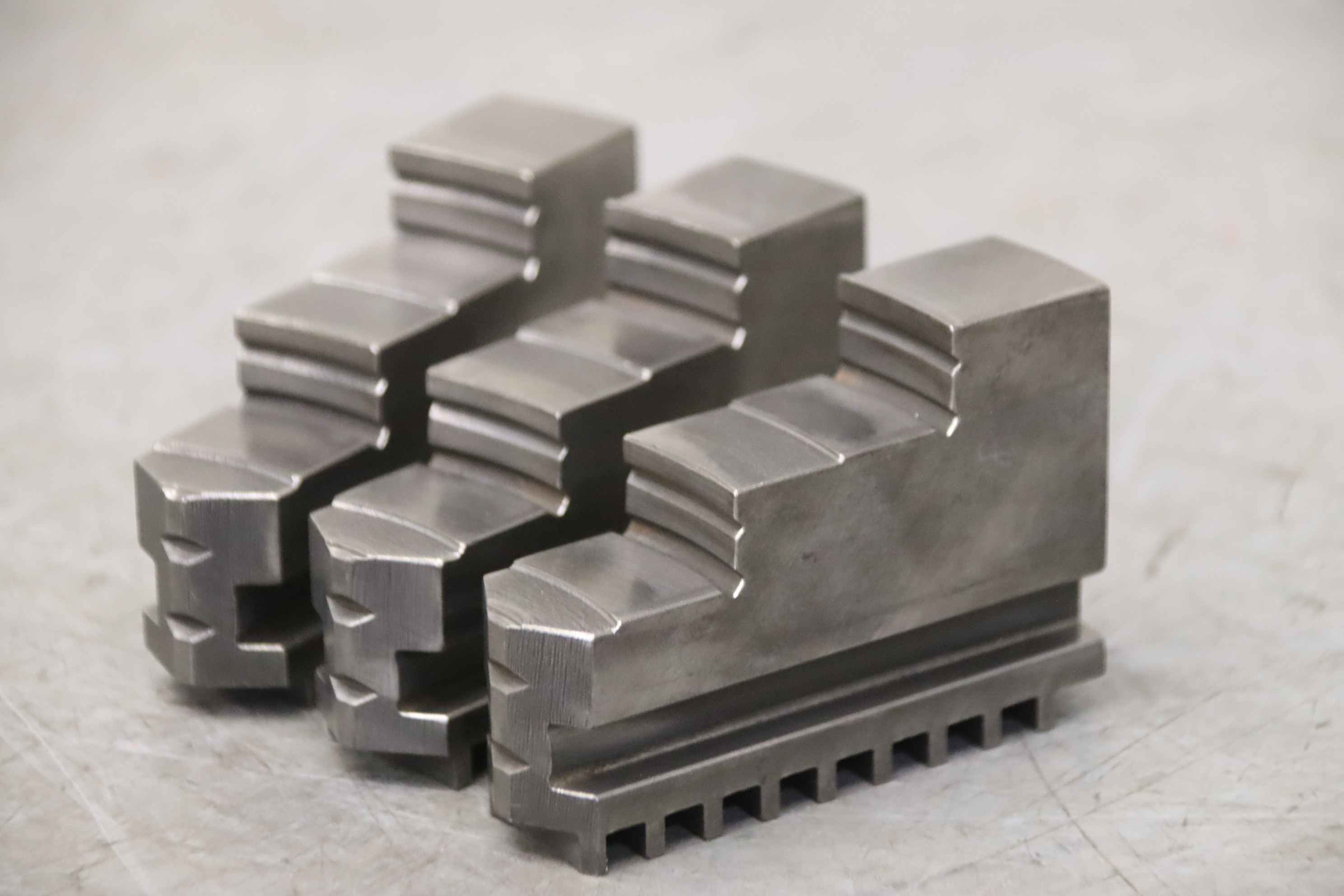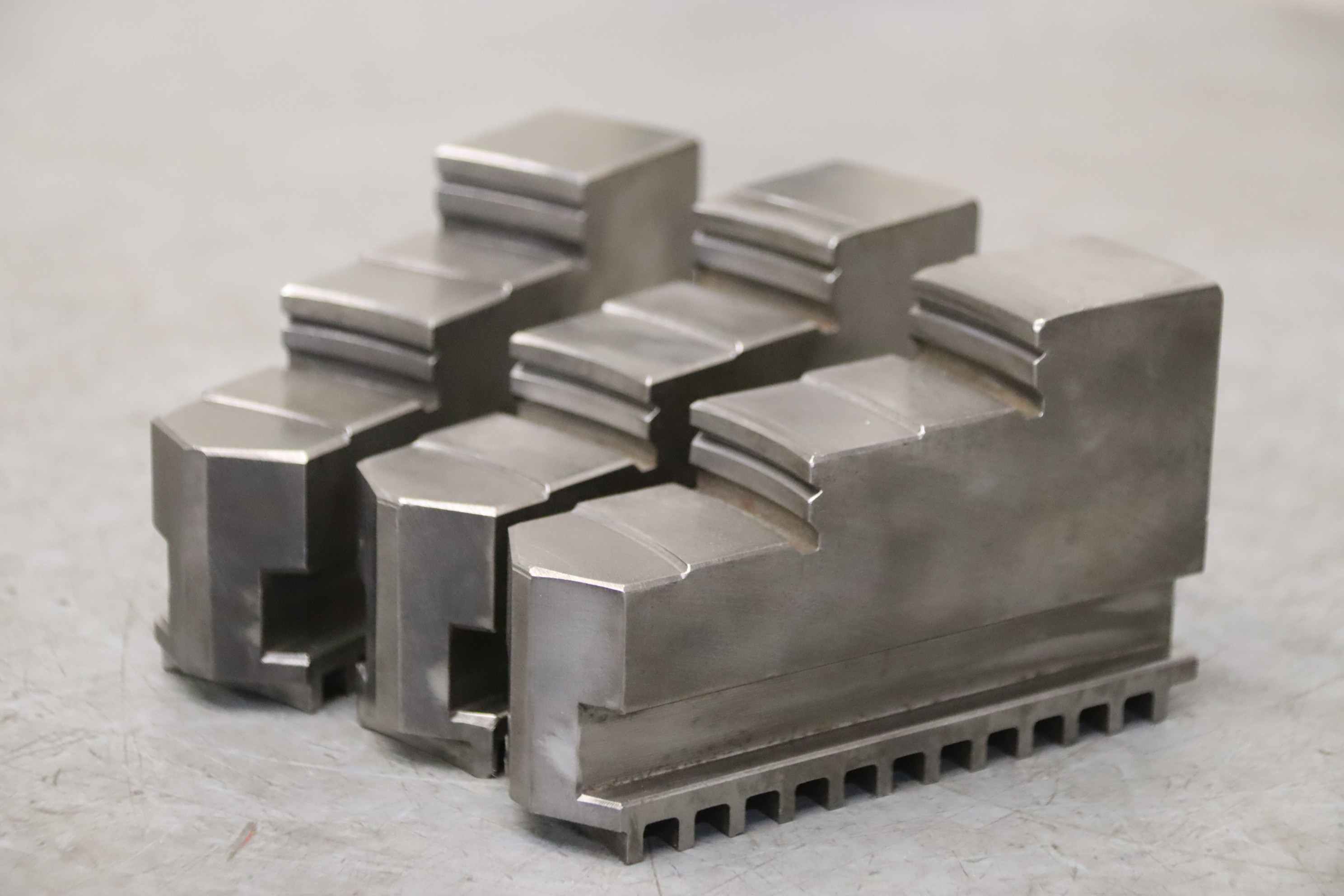 Interchangeable jaws, top jaws, three-jaw chucks, segment jaws, clamping jaws, step block jaws, step top jaws, block jaws, base jaws-Top jaws: Jaw set for three-jaw lathe chucks, hard-Jaw width: 34 mm-Dimensions: see photo technical. drawing-Total dimensions: 131/102/H80 mm -Total weight: 5,4 kg