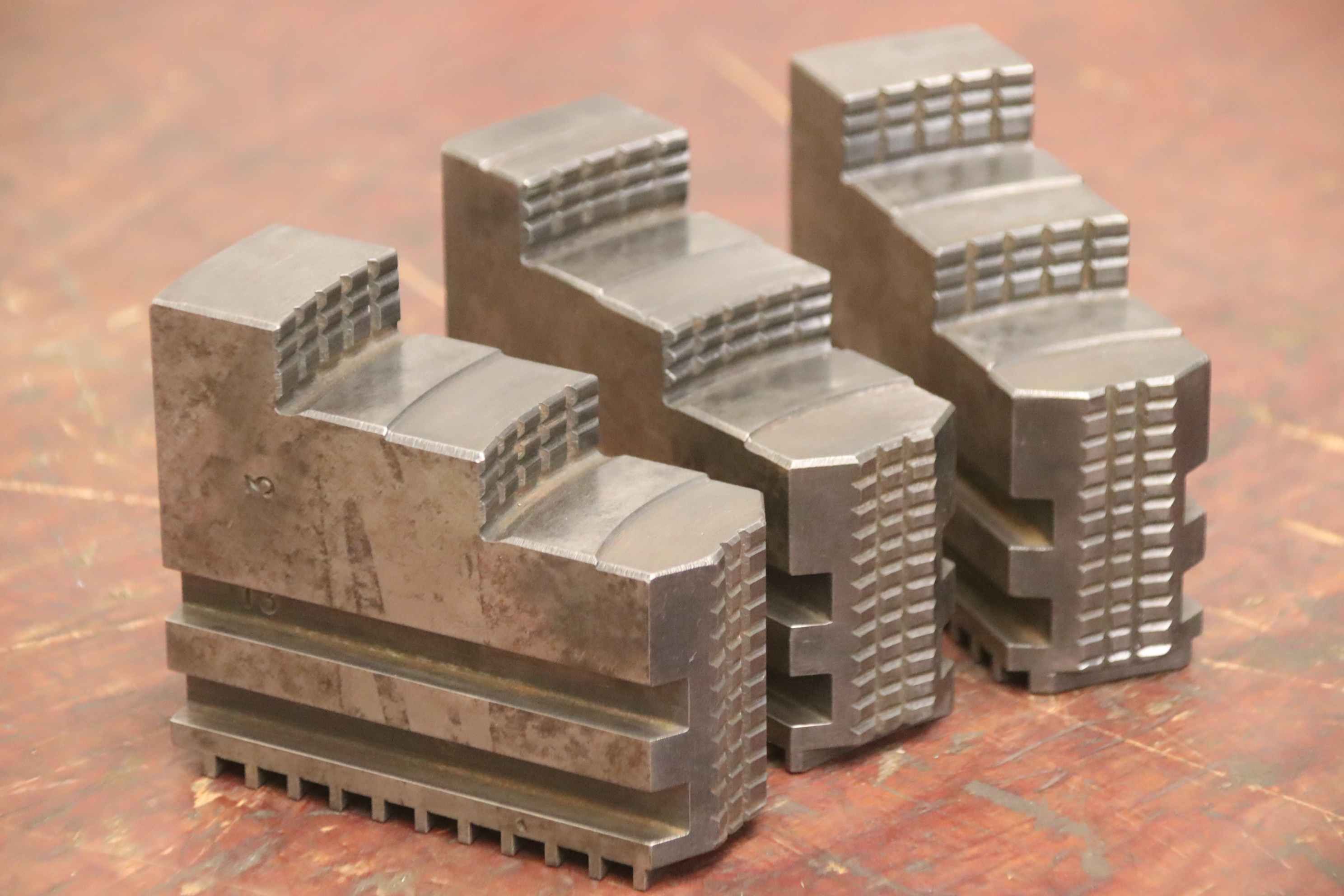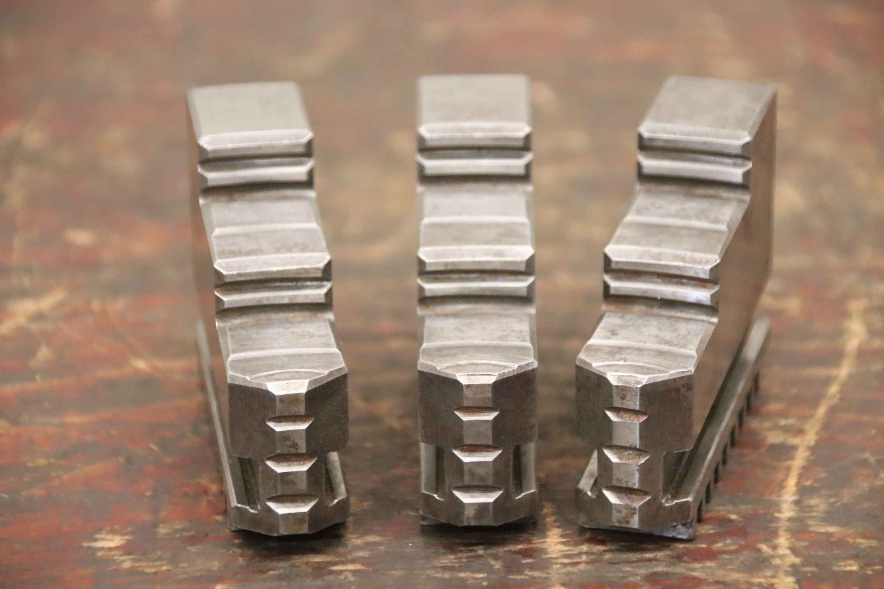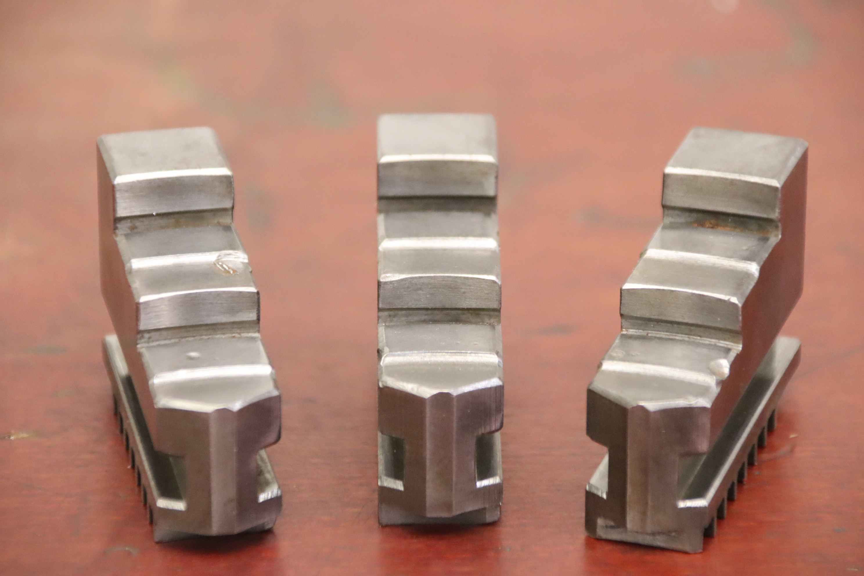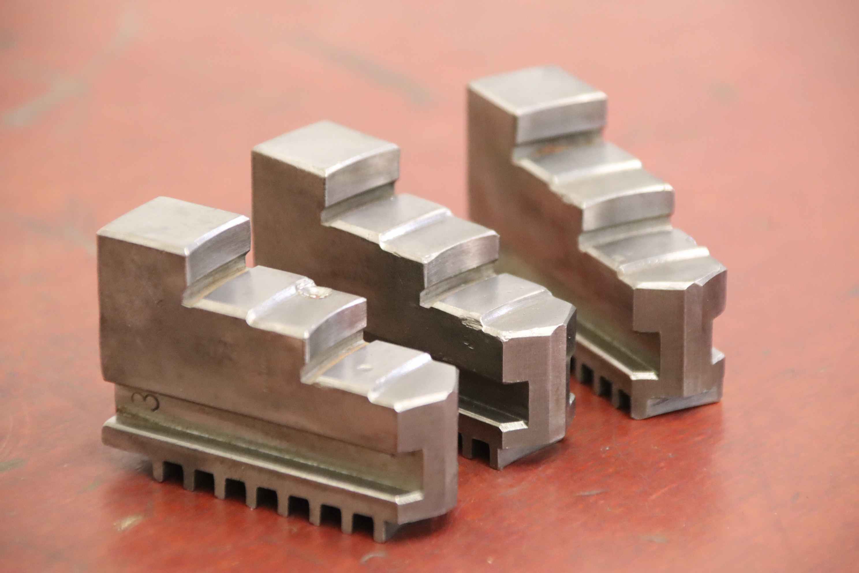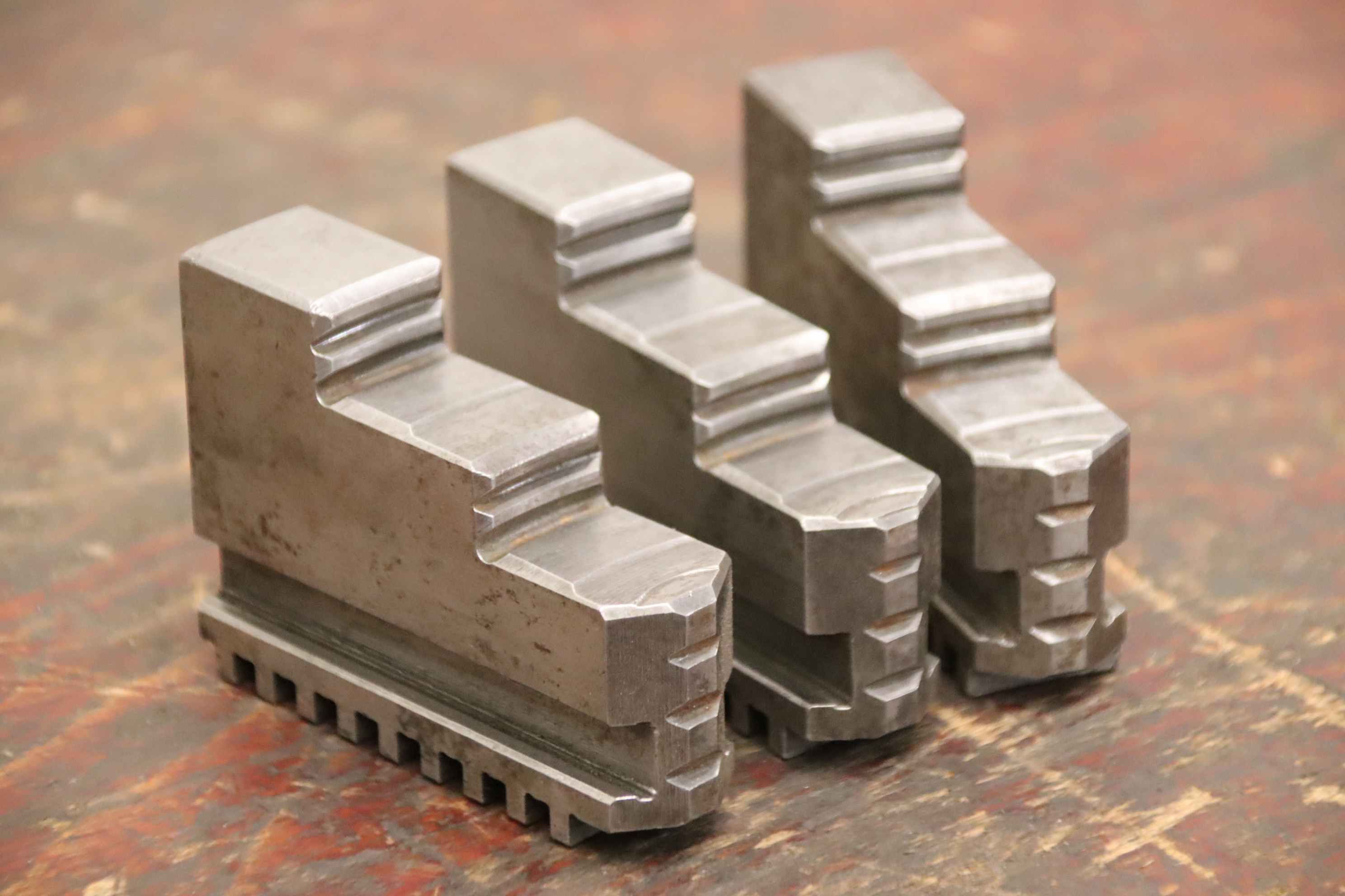 Interchangeable jaws, top jaws, three-jaw chucks, segment jaws, clamping jaws, step block jaws, step top jaws, block jaws, base jaws, 4-jaw set-Top jaws: Jaw set for three-jaw lathe chucks, hard-Jaw width: 20 mm-Dimensions: see photo technical. drawing-Total dimensions: 85/66/H62 mm-Total weight: 1.7 kg