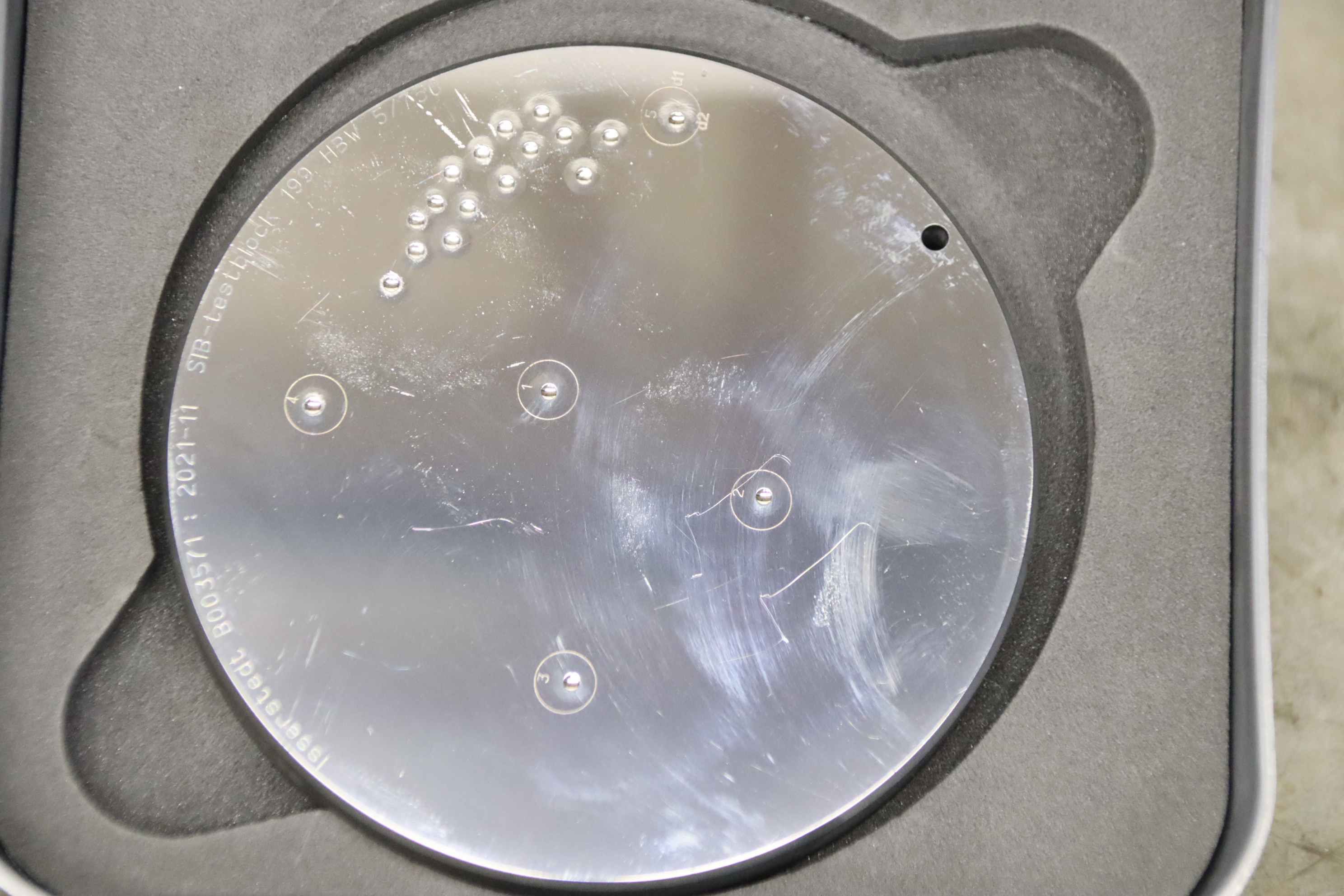 Hardness tester, hardness measuring machine, hardness tester, hardness tester, impact hardness tester, hardness comparison plate, test block, calibration and adjustment plate-Manufacturer: SiB, hardness reference block test block-Type: 199HBW 5/750-Dimension box: 180/170/H35 mm-Weight: 1.4 kg