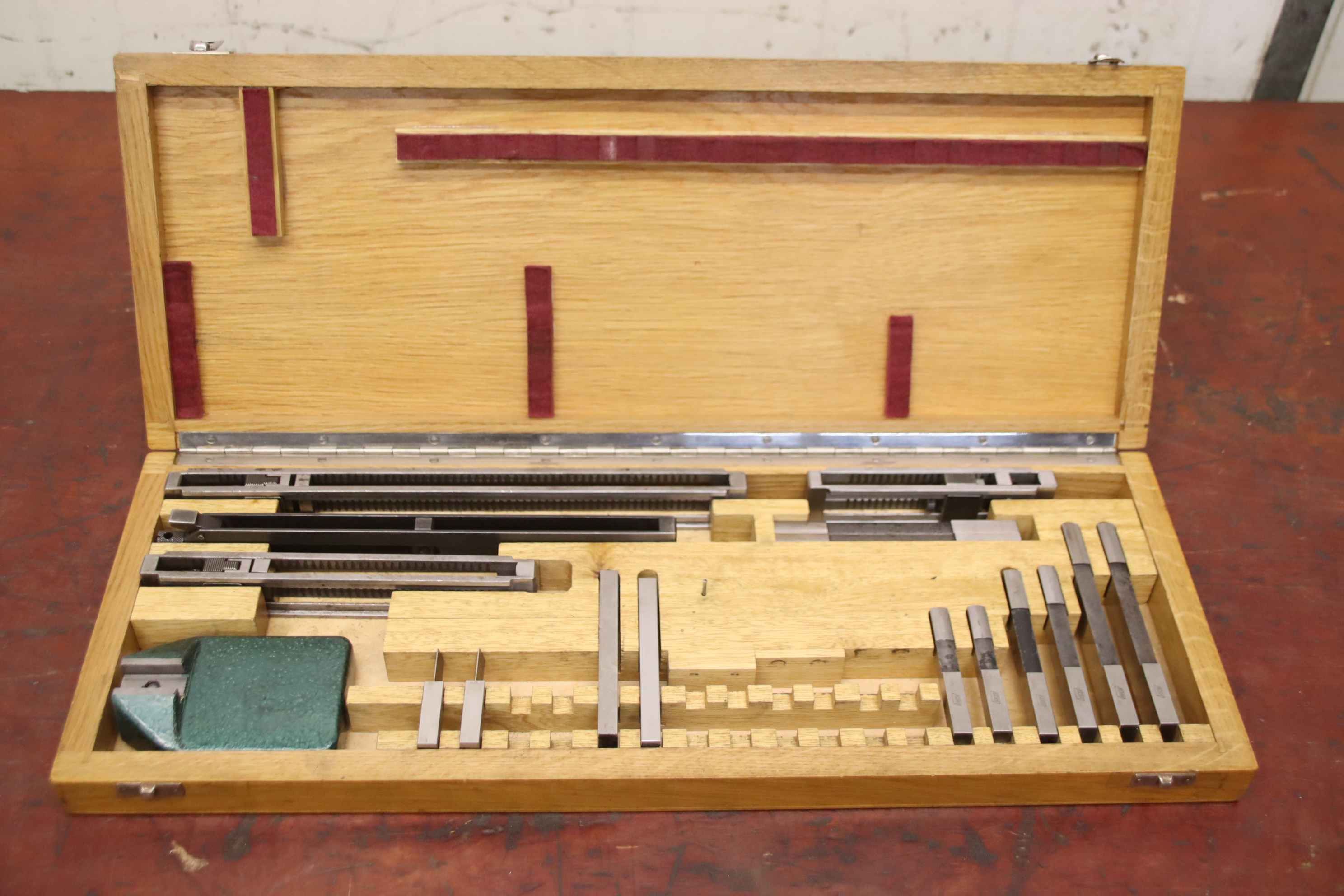 gauge block box, gauge blocks, gauge block holder, parallel support, parallel support pair, plane-parallel measuring leg-Manufacturer: Koba, parallel gauge block set-Gauge block holder: 0-200-Gauge block set: not complete, see photos for contents-Dimensions case: 545/210/H45 mm-Weight: 5.0 kg