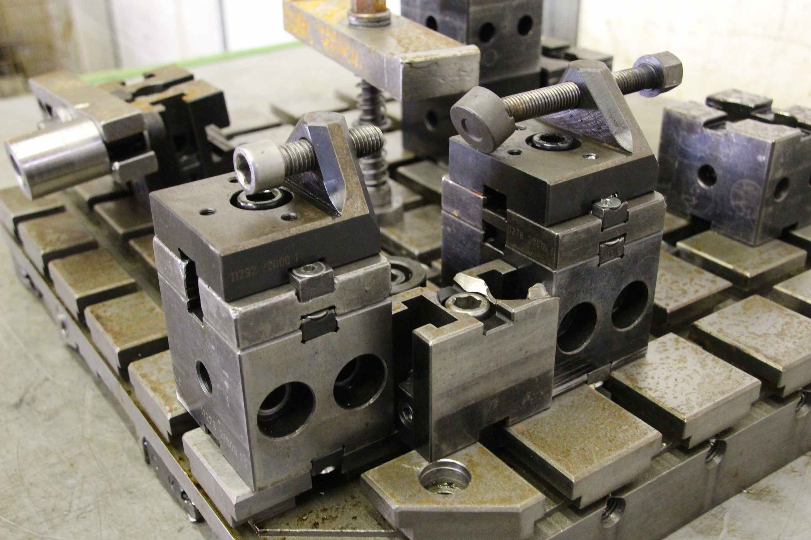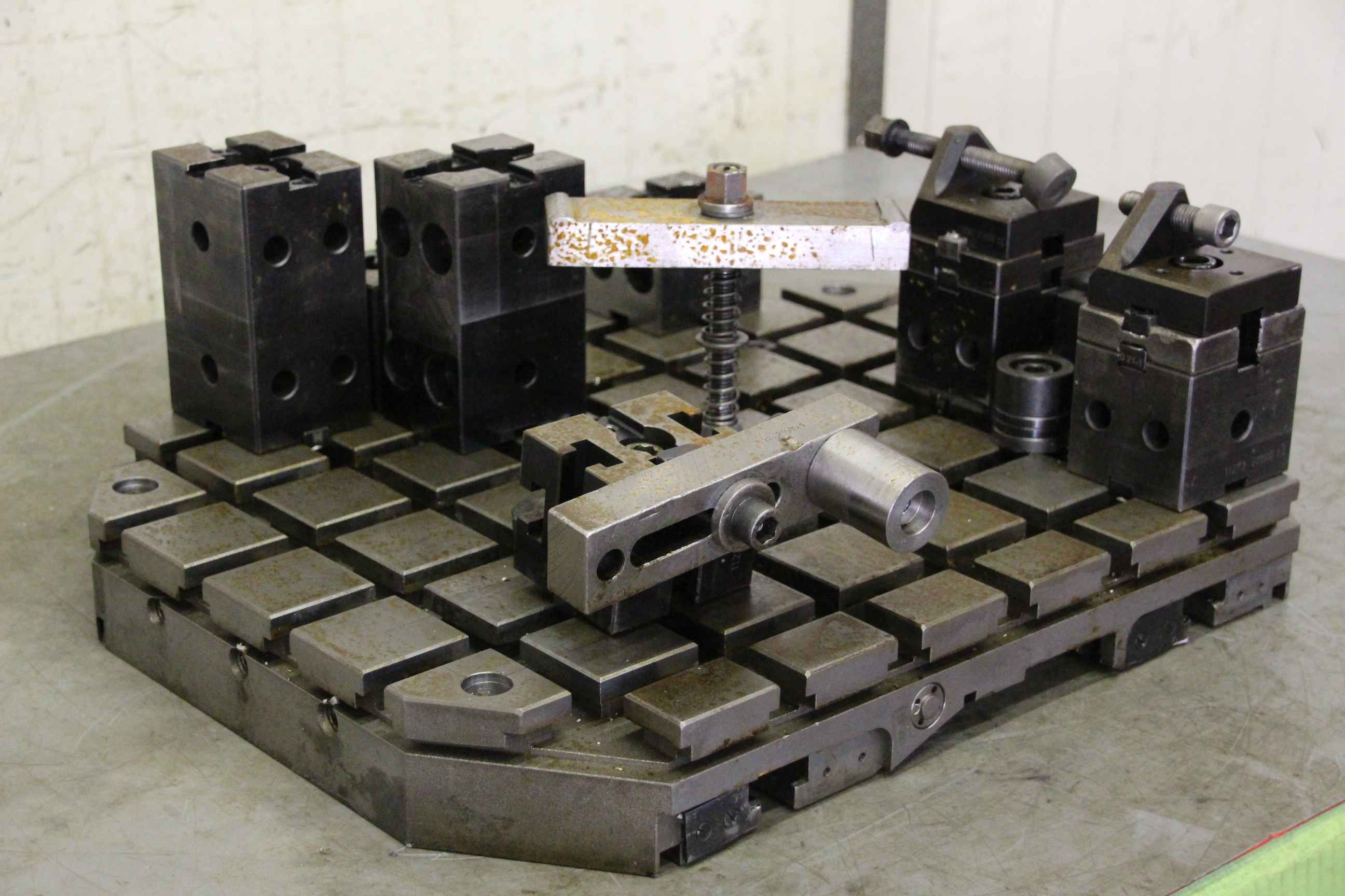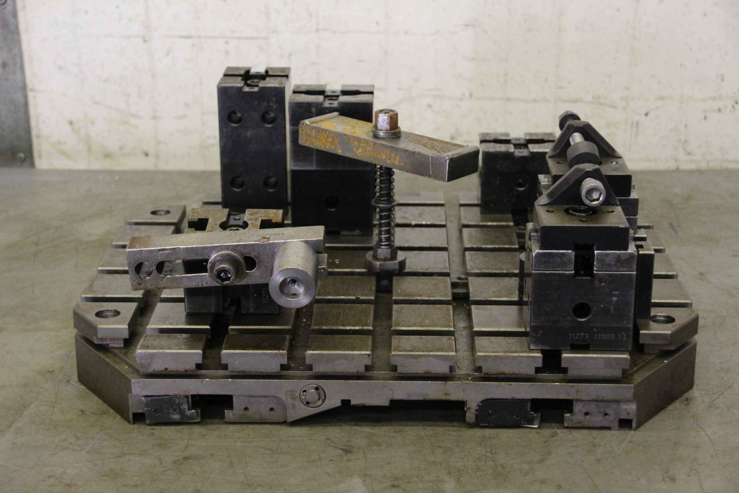 Clamping plate with T-slots and cross table, plate field, welding table, welding table, plate boring machine, T-slot plate, pallet changer, pallet changing system -Clamping plate: with T-slots and clamping devices, comes from a CNC machining center -Width: 395 mm -Length: 512 mm -Groove width: 14 mm -Groove spacing: 64 mm -Dimensions total: 512/395/H65 mm -Weight: 71 kg