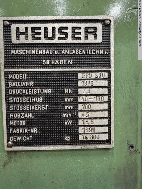 pressure: 230 tthroat: 345 mmstroke: 40-160 mmno. of strokes: 45 Hub/minram - range of adjustment: 100 mmtable surface area: 1000x660mm mmram surface: 700x500 mmtable height: 800 mmtool hole in ram: Ø65 mmtotal power requirement: kWweight of the machine ca.: tdimensions of the machine ca.: mThe data for this ad was created with ModulMWS - the software solution of LogoTech oHG.