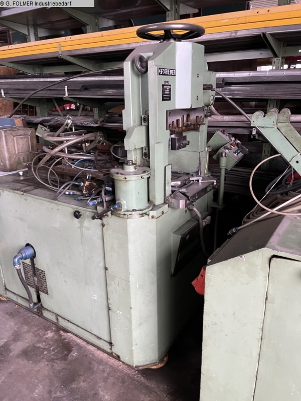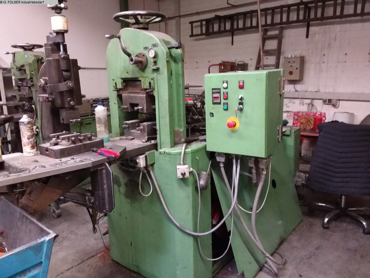 (1973) Prensa conjunta Gräbener de 180 toneladas Prensa de unión de precisión para conformado en frío detallado Este modelo Gräbener de 1973 utiliza un mecanismo de unión articulada para entregar una alta fuerza de presión con velocidad controlada del ram, lo que lo hace ideal para tareas de acuñación y relieve de precisión. Cuenta con un diseño compacto y una capacidad de 180 toneladas y está equipado con un motor de 5,5 kW para un funcionamiento industrial fiable. Detalles técnicos Tipo de máquina: prensa de articulación articulada Fabricante: Gräbener Modelo: GK 180 Año de fabricación: 1973 Fuerza nominal: 180t Carrera: 50 mm Ritmo de brazada: 40 golpes/min Altura de cierre: 305 mm Ajuste del portaherramientas: 40 mm Espacio entre los postes verticales: 390 mm Superficie de la mesa (Ancho x Profundidad): 370 mm x 450 mm Superficie de montaje ...