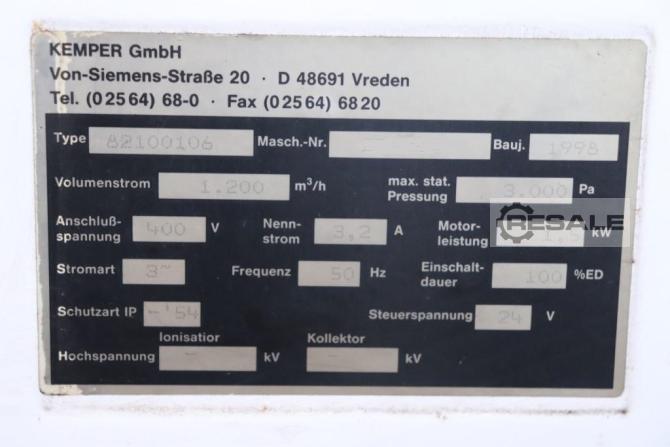 For sale is a used rollable cartridge filter extraction system, from the manufacturer Kemper. The extraction system is in good condition, and is functional and ready for use. Year of Make: 1998 Type: 82100106 Volume flow: 1200m³/h Connected load: 400 V Frequency: 50 Hz Motor power: 1.5 kW Control voltage: 24 V Weight: approx. 200 kg