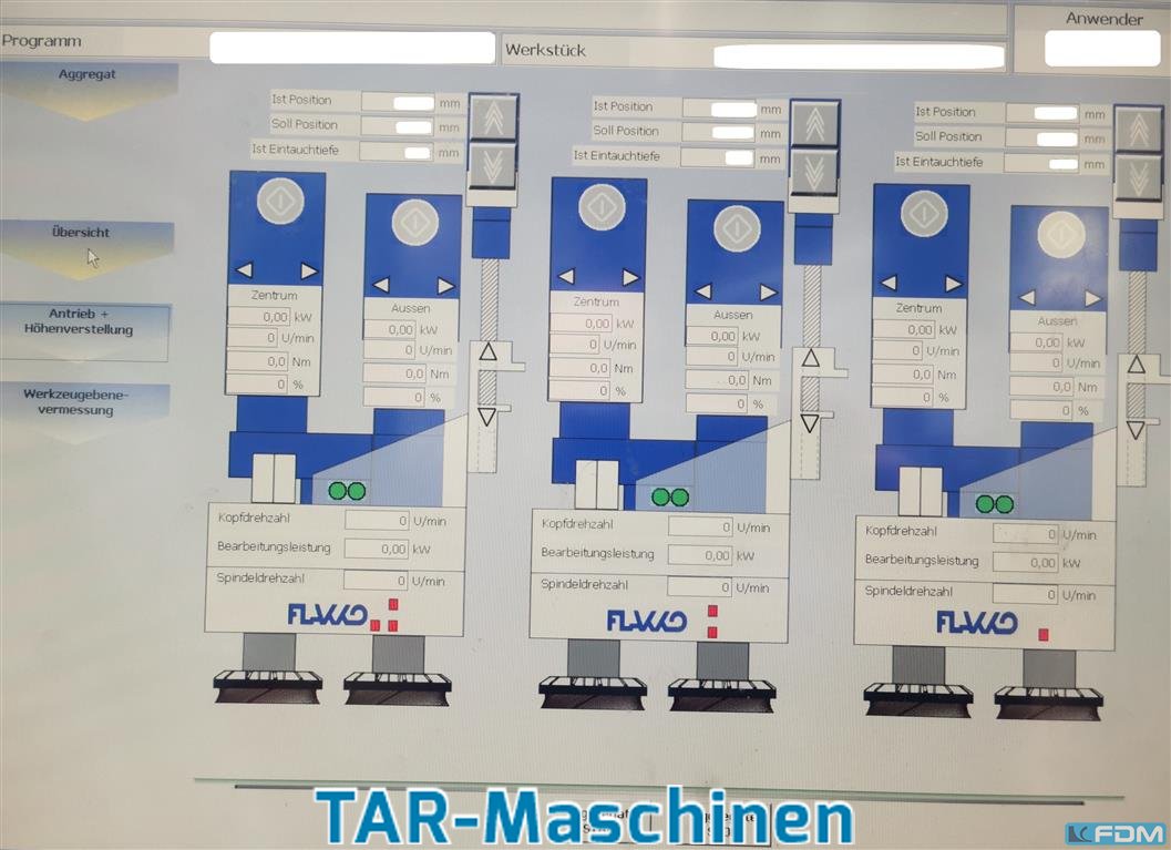 Finishing machine single-sided machining or double-sided machining, second-hand 3 FLAKKO units with 4 disc tools each: Drive power 7.5kW Spindle speed 300 - 2500 rpm Feed speed 2-20 m/min Wet machining Tool diameter 230mm Working width 400mm for single-sided machining Working width 200mm for double-sided machining with turning device Special magnetic inserts designed for hot machining IPC control with PLC Connected load 3x 400V 50Hz Connected load approx. 52 kW Overhaul of all units with conversion to new 4-point bearing between 2021 and 2023. Special-price 25.000 EURO, net -free loaded truck- Please, contact us for getting more information and pictures on mail(at)tar-mc.com or www.tar-mc.com