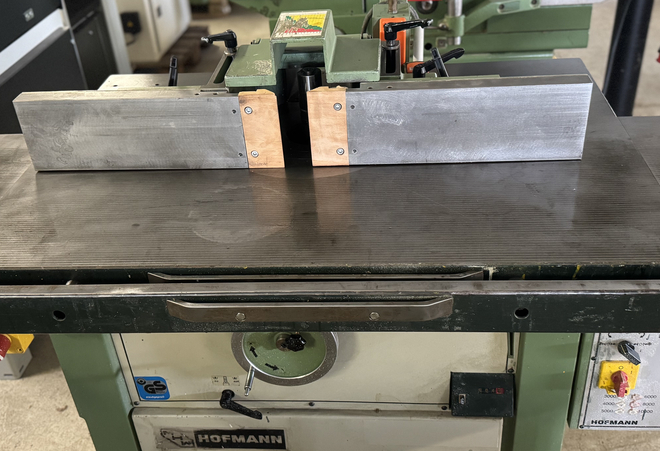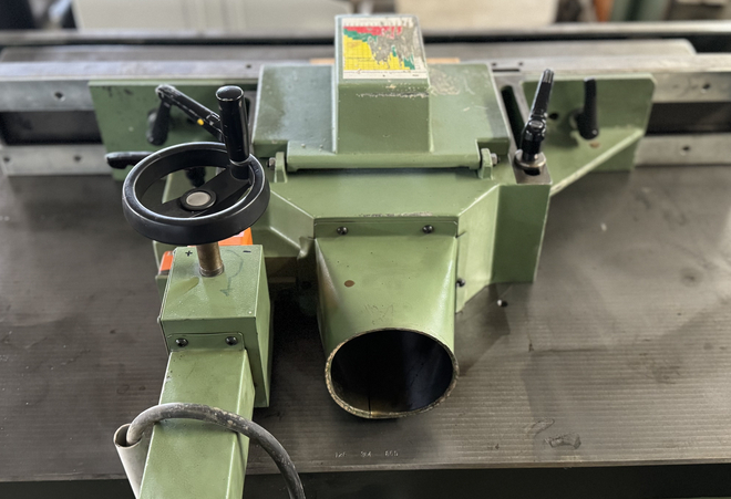 Fresadora de eixo giratório HOFMANN TFS 1200 Ano de fabrico: 2004 S/N 127-01323 Fabricante: Hofmann Bad Windsheim de uma empresa de formação muito bom estado ajuste elétrico de altura e giro ajuste manual de altura e giro para ajuste fino visor analógico para ajuste de altura, ajuste de altura 125mm Tamanho da mesa 1200 x 820mm e extensão da mesa 200 x 820mm Faixa giratória -5 a + 45 Velocidade do eixo 3000/4000/5000/6000/8000/10000 rpm. Eixo de fresagem D=30mm mandril de fresagem MK5 Motor 4.7 Kw / 6.3 cv Bico de sucção D=120 mm Mesa de rolo lateral com dispositivo de retenção excêntrico e parada angular ajustável Altura ajustável com volante Marcação CE Peso 1300 kg